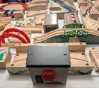 I counted 337 individual pieces. Train tracks come from a mixed set from late 90s to early 2000s. See photos for details! Some tracks double as roadways when flipped. 16 pieces are plastic, not wood. Lot weighs just under 50 pounds and is quite large so please keep in mind regarding shipping. Local pickup is also available.