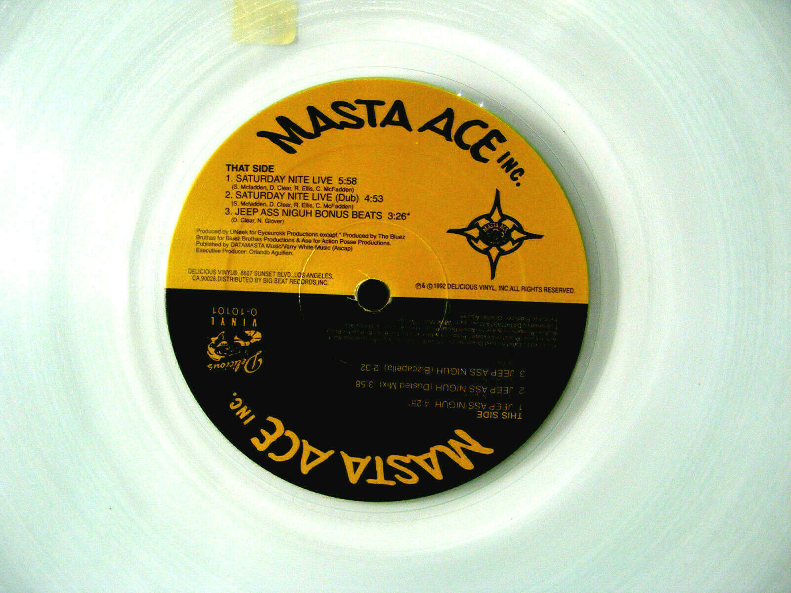 Black Americana Masta Ace Incorporated Jeep Ass Niguh B/W Saturday Night Live 12" Clear Near Mint Green Record Notched sleeve. Stunning clear near mint green record. Black Americana Recording Artist. Tracklist A1 Jeep Ass Niguh 4:25 A2 Jeep Ass Niguh (Dusted Mix) 3:58 A3 Jeep Ass Niguh (Bizcapella) 2:32 B1 Saturday Nite Live 5:58 B2 Saturday Nite Live (Dub) 4:53 B3 Jeep Ass Niguh (Bonus Beats) 3:26 BE AWARE THAT 1 BLACK AMERICAN MASTA ACE INCORPORATED JEEP ASS NIGUH B/W SATURDAY NIGHT LIVE CLEAR NEAR MINT GREEN RECORD IS FOR SALE ONLY. NO ODORS. Please pay within 2 days.