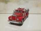 The Matchbox 1956 Mack B-95 Pumper Fire Truck Engine is a diecast model of a classic fire truck from the Models Of Yesteryear series. This special edition vehicle in 1:45 scale features a red color scheme with details specific to the Evans City, PA Fire Department. This collectible is a detailed replica of a 1956 fire engine, suitable for display by enthusiasts aged 15 and up. The model was manufactured in 1998 in China for Matchbox.