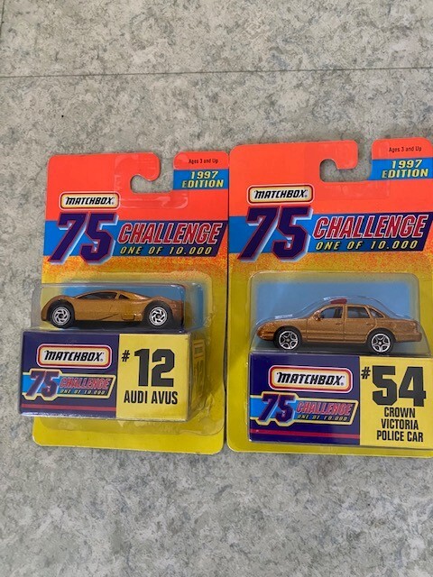 MATCHBOX LOT OF 2 1997 EDITION 75 CHALLENGE GOLD AUDI AVUS #12 & CROWN VICTORIA POLICE CAR #54. NEW. SHIPPED WITH USPS FIRST CLASS MAIL.