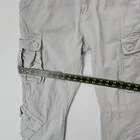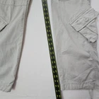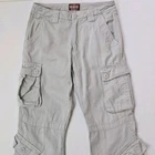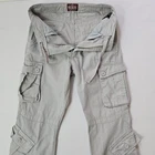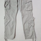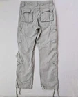 100% Cotton heavy duty multi pocket Cargo utility pants color beige. Drawstring waist and lower leg slash hand pockets with button closure Cargo pockets. Pants are in excellent clean condition no holes or tears. Sz 32 waist x 31 length