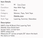 T’s Size M Blush Pink Layering Tank Matilda Jane Good Hart Scoop neck, curved hem 100% cotton knit Measures 21” across armpits 25” down the back No stains or holes