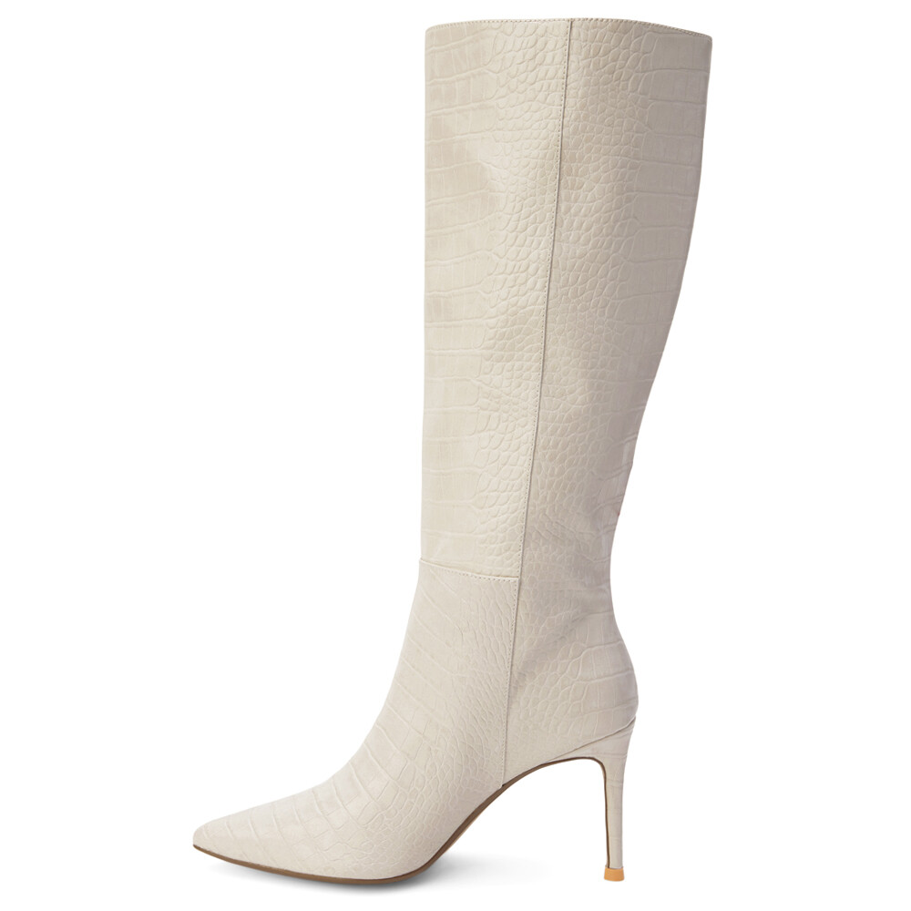 Alina Croc Pointed Toe Pull On Boots Product Details Synthetic upper Pull on entry with zippered closure Cushioned footbed for comfort Rubber outsole Heel Height: 2.5 inches, Shaft Height: 6 inches, Circumference: 10 inches Get this vegan, tall boot on a stiletto heel from your favorite shoe place Coconuts by Matisse! Additional Details Color: Off White Occasion: Casual Gender: Womens Age: Adult Brand: COCONUTS by Matisse