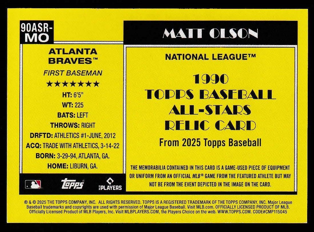 Matt Olson 2025 Topps Series 2 "1990 Topps Baseball All-Star Relics" BLUE Game Used Bat #052/150 ONLY 150 MADE ! Card #90ASR-MO. Only 150 Made. SUPER RARE GAME USED MEMORABILIA. Pulled fresh from a box of 2025 Topps Series 2 Jumbo Baseball. All cards will be shipped in a card sleeve, top loader, and team bag securely inside a bubble mailer. If auction goes for over $100.00, card will be shipped in a magnetic card holder and team bag. USPS Ground Advantage Insured Shipping in the United States is $3.75. Win multiple auctions and save on shipping ($0.75 for each additional item)!