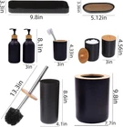 Matte Black Bathroom Accessories Set 9PCS,Bamboo Product Details Number of Pieces: 9 Finish Type: Polished Manufacturer: FNGJMJG Package Dimensions: 11.14 x 8.11 x 7.76 inches Item Weight: 2.57 pounds Country of Origin: China Item model number: HZ01-9P Fabric Type: Plastic Finish types: Polished Batteries required: No Material: Wood, Plastic, Bamboo Color: Black Brand: FNGJMJG Style: Modern Included Components: Toothbrush holders Toilet brush Soap dispenser Qtip holder Vanity tray Soap dish Trash can Plastic 【Durable Materials And Wooden Lid】Classic black matte paired with premium decor wooden accessory, not taking up space,made of sturdy and durable plastic,less prone to rust compared to metal,less prone to breakage compared to ceramic glass. 【Bathroom Accessories Sets Complete】Matte black bathroom set with a 9-piece set, including toothbrush holder, soap dispenser, toilet brush, qtip and cotton ball holder (can be used as a mouthwash cup), soap tray, vanity tray, and bathroom trash can. 【Easy To Store】 2 large capacity soap dispensers,can be pressed with one hand,automatic rebound,black bathroom traycan organize your countertop,can hold cosmetics,razors,towels, headbands,or other bathroom essentials,you can put flowers,aromatherapy,candles,or house accessories,aesthetic bathroom décor. 【Practical Functions】Qtip holder has a wooden lid,store cotton swabs,cotton balls,dental floss, etc,it can also be used as a mouthwash cup.The trash can can be used directly,no need to touch to open,don't worry about the bucket lid getting your hands dirty,toilet brush can better clean gaps and corners. 【Multipurpose】Suitable for various styles of bathrooms,hotels,apartment,household,restroom,rv,new home,farmhouse different scenarios,can be used as a birthday gift,mother's day gift,valentine's day gift,christmas gifts,thanksgiving gift for family,friends,colleagues,etc.