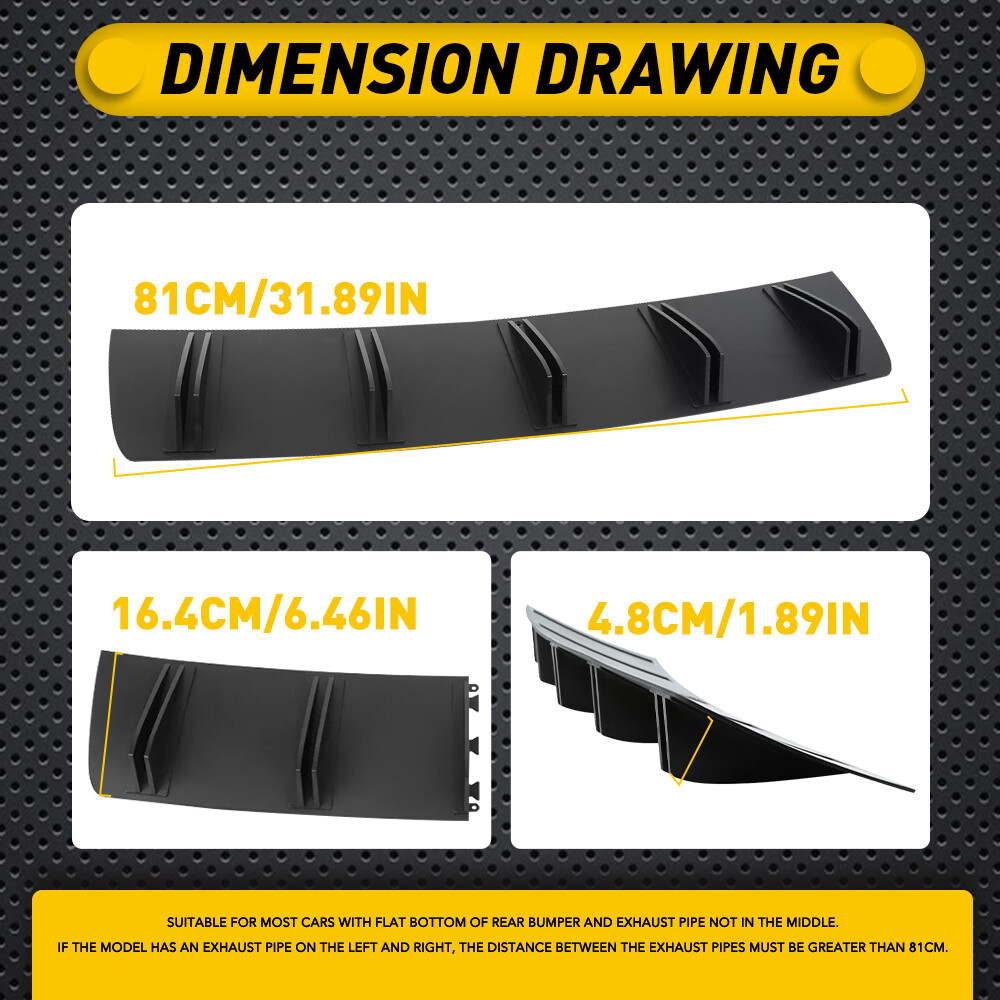 Fit for: Suitable for most cars with flat bottom of rear bumper and exhaust pipe not in the middle. If the model has an exhaust pipe on the left and right, the distance between the exhaust pipes must be greater than 81cm. Specifications: Product Material: ABS Color: Matte black (as pictures show) Placement on Vehicle: Lower, rear Features: 【Reduce Air Resistance】 This shark fin diffuser designed to increase a vehicle's aerodynamic performance and improve the stability of vehicle during fast driving. 【Excellent Appearance】 Matte Black Look Rear Lower Bumper Diffuser Fin Spoiler Lip Wing Splitter Fit for: Suitable for most cars with flat bottom of rear bumper and exhaust pipe not in the middle. If the model has an exhaust pipe on the left and right, the distance between the exhaust pipes must be greater than 81cm. Specifications: Product Material: ABS Color: Matte black (as pictures show) Placement on Vehicle: Lower, rear Features: 【Reduce Air Resistance】 This shark fin diffuser designed to increase a vehicle's aerodynamic performance and improve the stability of vehicle during fast driving. 【Excellent Appearance】 Shark fin and clean lines design with beautiful appearance to decorate your car, which gives your vehicle a more aggressive racing look. 【ABS Material】 Made of ABS material with high-quality, waterproof, durable functions and will not easy to break. 【Universal Fit】 Universal fit for most cars, please measure the size before purchasing. Note: Please confirm the size and make sure that there is enough space to install before purchasing!!! Professional installation is required. Packaging Include: 1 x Rear Shark Fin Bumper Diffuser 1 x Screws kit 1 x Double sided adhesive tape Item Specifics Material ABS Mounting Hardware Included Yes Placement on Vehicle Lower Rear Brand AUXITO Color Matte black (as pictures show) Type Rear Bumper Lip Warranty 5 Years Number of Pieces 1 Fitment Type Direct Replacement Attachment Method Screws Payment Variety of payment methods are accepted, such as credit, debit, gift cards, Apply pay, Google Pay, Paypal and Paypal Credit. Shipping 1. All items will be shipped in 24 hours after receiving your payment . 2. We ship this item to US only via USPS first class mail. It usually takes 3-5 working days to deliver. Returns 1. We offer 60 days return policy. 2. Please contact us if you have any questions with the products . 3. Refund will be sent after we got your returned package. 4. All returned items should be in the original packaging with tracking number. Contact Us We work from Monday - Saturday 9:00AM - 6:00PM, but we will reply once we get your message. There will be delay on response if you send message or E-Mail on Sunday. DESCRIPTION PAYMENT SHIPPING RETURN POLICY CONTACT US Shop Category Store Home LED Headlight ◈ 9005 HB3 ◈ 9006 HB4 ◈ 9007 HB5 ◈ H4 9003 HB2 ◈ H7 LED Fog Light ◈ H8 H9 H11 LED Plate Light LED Reverse Light LED Brake Light Rear Bumper Light LED Tail Light Tail Light assemblies Car Parts & Accessories ◈ LED Third Brake Light ◈ Other Parts & Accessories Other New List Item Hot Item Excellent Delivery Matte Black Look Rear Lower Bumper Diffuser Fin Spoiler Lip Wing Splitter Fit for: Suitable for most cars with flat bottom of rear bumper and exhaust pipe not in the middle. If the model has an exhaust pipe on the left and right, the distance between the exhaust pipes must be greater than 81cm. Specifications: Product Material: ABS Color: Matte black (as pictures show) Placement on Vehicle: Lower, rear Features: 【Reduce Air Resistance】 This shark fin diffuser designed to increase a vehicle's aerodynamic performance and improve the stability of vehicle during fast driving. 【Excellent Appearance】 Shark fin and clean lines design with beautiful appearance to decorate your car, which gives your vehicle a more aggressive racing look. 【ABS Material】 Made of ABS material with high-quality, waterproof, durable functions and will not easy to break. 【Universal Fit】 Universal fit for most cars, please measure the size before purchasing. Note: Please confirm the size and make sure that there is enough space to install before purchasing!!! Professional installation is required. Packaging Include: 1 x Rear Shark Fin Bumper Diffuser 1 x Screws kit 1 x Double sided adhesive tape Item Specifics Material ABS Mounting Hardware Included Yes Placement on Vehicle Lower Rear Brand AUXITO Color Matte black (as pictures show) Type Rear Bumper Lip Warranty 5 Years Number of Pieces 1 Fitment Type Direct Replacement Attachment Method Screws Payment Variety of payment methods are accepted, such as credit, debit, gift cards, Apply pay, Google Pay, Paypal and Paypal Credit. Shipping 1. All items will be shipped in 24 hours after receiving your payment . 2. We ship this item to US only via USPS first class mail. It usually takes 3-5 working days to deliver. Returns 1. We offer 60 days return policy. 2. Please contact us if you have any questions with the products . 3. Refund will be sent after we got your returned package. 4. All returned items should be in the original packaging with tracking number. Contact Us We work from Monday - Saturday 9:00AM - 6:00PM, but we will reply once we get your message. There will be delay on response if you send message or E-Mail on Sunday. All rights reserved. On May 22, 2025 at 13:44:33 PDT, seller added the following information: