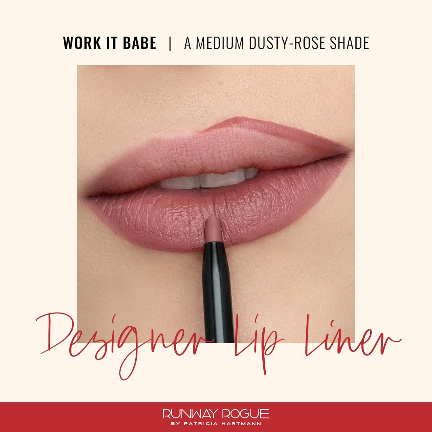 Designer Liner Lip Pencil, Matte Medium Dusty-Rose Lip Liner Pencil and Lip Liner Sharpener, ‘Work It Babe’ MATTE LIP LINER PENCIL: Designer Lip Liner is a creamy matte lip pencil designed to help contour and enhance your natural lip shape, keep your lipstick in place, and prevent lipstick from feathering and bleeding while also improving its long wear and lip color. ‘Work It Babe’ is a medium dusty-rose lip liner shade. SHARP LASTING LIP LOOKS: Make your lip makeup last by using our non-feathering, non-bleeding, and smudge- and water-resistant matte creamy lip liner. Define and fill your lip shape, or wear the color on its own. The built-in sharpener helps with precise application. CREAMY VEGAN FORMULA: A pout you feel good about! Our cruelty-free, vegan lip liner is long-lasting and features anti-aging peptides, smoothing shea butter, and 3D Chroma Technology with palmitoyl tripeptide-1 to help fill in fine lines and visually plump lips. APPLY LIKE THE PROS: Define your lips by lining out toward the corners. Get fuller lips by drawing over the edge of your natural lip line, or fill in the entire lip. Recap to protect the formula. Pair this lip pencil liner with liquid or traditional lipstick, or use it as a lip gloss definer. RUNWAY WORTHY, MADE FOR REAL LIFE: Founded by ’90s supermodel and cover girl Patricia Hartmann, who was mentored backstage by makeup legends, Runway Rogue creates luxurious, easy-to-use lip products for on-the-go women who desire the runway look without the runway hassle. Elevate your every day with Runway Rogue, where glamour meets convenience, and make every moment your real-life catwalk. Product Description The video showcases the product in use. The video guides you through product setup. The video compares multiple products. The video shows the product being unpacked. 1 APPLY LIKE THE PROS 2 DEFINE THE LINE 3 FOR A FULLER LOOK Our Collections Add to Cart Add to Cart Add to Cart Add to Cart Customer Reviews 4.3 out of 5 stars 512 3.9 out of 5 stars 376 4.0 out of 5 stars 852 4.0 out of 5 stars 730 Price $22.00 $ 22 . 00 $29.00 $ 29 . 00 $29.00 $ 29 . 00 $27.00 $ 27 . 00 Finish Matte, creamy Matte meets moisture Shiny, shimmery Silky, shimmery, high-pigment Type Lip liner Lipstick case Tube liquid lipstick Lip gloss Features Smudge- and water-resistant No feathering or bleeding Transfer-proof formula Protects and restores lips Number of Shades 10 7 Silk Glam: 9; Pearl Glam: 8 5 Vegan/Cruelty-Free ✔ ✔ ✔ ✔ Dimensions 1.83 inches x 5.25 inches x 0.88 inches. Weight: 0.32 oz Specifications Item model number DL04 Color Work it Babe Item Form Pencil Product Dimensions 5.25 x 1.83 x 0.88 inches; 0.32 ounces Country of Origin USA Skin Type All Finish Type Semi-Matte Creme Velvet Shipping: Shipped from the USA. Fast delivery within 2–3 days. Payment: PayPal, credit card, bank transfer. Returns: 30-day free return – we cover the shipping cost. Quality: Made in Europe/USA/China. No customs fees. VAT invoice on request. Feedback: You’ll automatically receive positive feedback after payment.