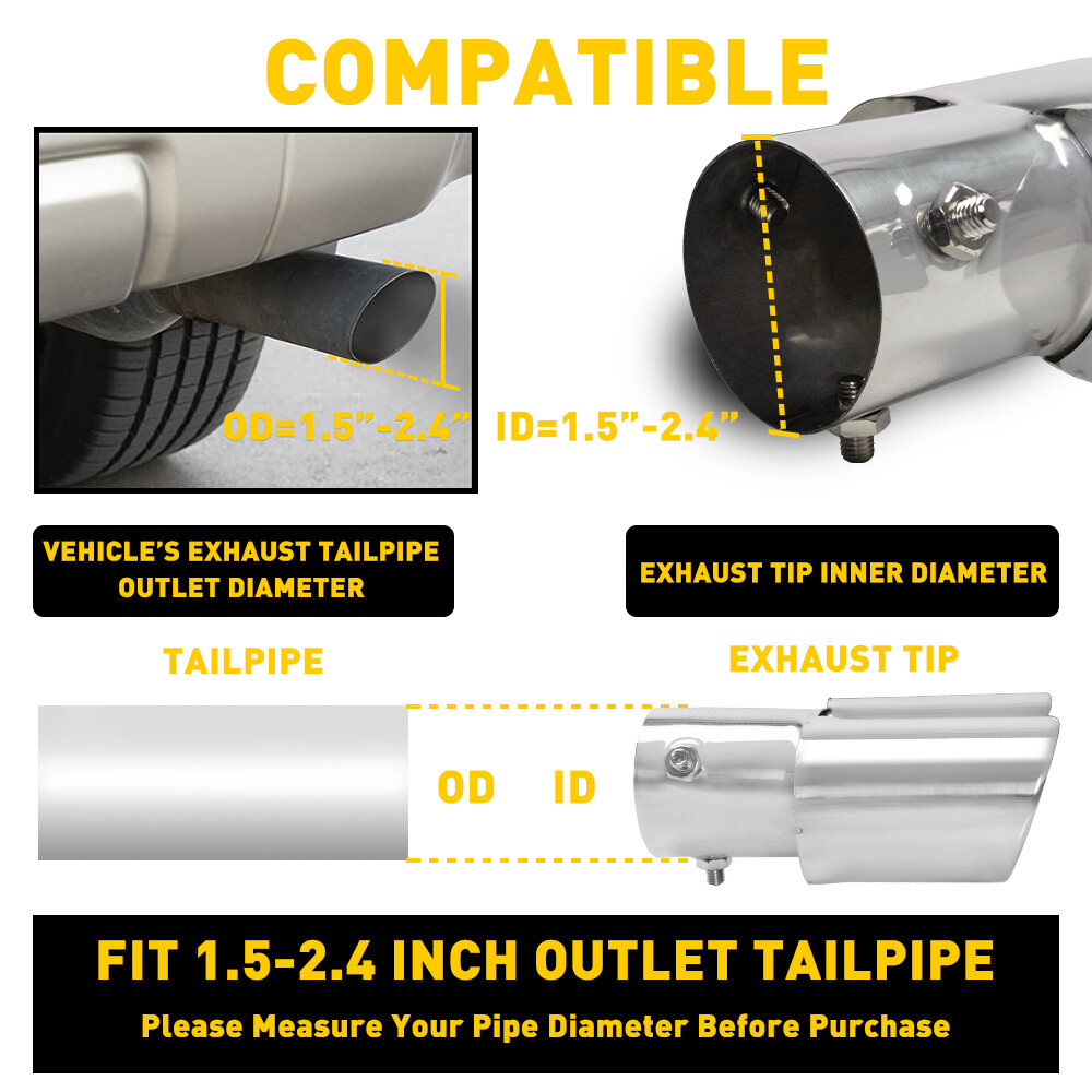 Features: *Simple installation Easy installation with a direct replacement, other modifications like welding or punch are not required. You can fix the screw with a wrench in the appropriate position of the exhaust pipe. *Polished surface The exhaust tip with exquisite workmanship and shiny appearance increases the style of sports effect for the car. *Superior quality High-quality stainless steel material with surface polishing treatment is not easy to rust and deformation. *Special design The small drainage hole design can prevent water accumulation. *Installation steps: 1.Clean the tailpipe surface 2.Putting the exhaust tip on 3.Fasten the exhaust tip Matte Silver Steel Stainless Exhaust Tip for 1.5-2.4inch Outlet Double Tailpipe Features: *Simple installation Easy installation with a direct replacement, other modifications like welding or punch are not required. You can fix the screw with a wrench in the appropriate position of the exhaust pipe. *Polished surface The exhaust tip with exquisite workmanship and shiny appearance increases the style of sports effect for the car. *Superior quality High-quality stainless steel material with surface polishing treatment is not easy to rust and deformation. *Special design The small drainage hole design can prevent water accumulation. *Installation steps: 1.Clean the tailpipe surface 2.Putting the exhaust tip on 3.Fasten the exhaust tip *Note: 1.Please measure the outside diameter of your exhaust pipe before purchase, otherwise our product will not fit your car. This tips fit only 1.5 - 2.4 inch outlet tailpipe 2.Please check your original tailpipe's type. Straight tailpipe is for straight type, and curved tailpipe is for curved type. Specifications: Material: stainless steel Color: Silver Type:Double tailpipe - Straight Cut Fit for: the outer diameter model with 1.5-2.4inch Package Contents: Exhaust Tip*1 Warm Tips: 1. The distance between the pipe and the bumper should be more than 2cm, so that the high temperature produced by the pipe will not burn the bumper. 2. Wear gloves to avoid hurt when installing. 3. Do not install this product when the car has just stopped or started to avoid being burned by the exhaust pipe 4.Please allow minor deviation due to manual measurement. 5.Due to the difference between different monitors, the picture may not reflect the actual color of the item. Thank you!your kind understanding will be much appreciated. Note: (1)Negative feedback will not help resolve any problems you have, please contact us via eBay messages before leaving negative feedback, our customer service will make best effort to help you with the issues. (2)We maintain high standards of excellenceand strive for 100% customer satisfaction! Feedback is very important to us. We request that you contact us immediately BEFORE you give us neutral or negative feedback, so that we can satisfactorily address your concerns. Item Specifics Manufacturer Part Number Exhaust Pipe Material Stainless Steel Manufacturer Warranty 2 Year Suitable for the outer diameter model with 1.5-2.4inch Tip Inlet Diameter 6.4cm (2.5inch) Color Silver Type One tailpipe - Straight Cut Tip Installation Type Clamp-on Exhaust Tip Design Round Feature Dual Exhaust Pipe Placement on Vehicle Rear Fitment Type Direct Replacement Features Simple installation Features 1 Polished surface Packaging include Exhaust Tip*1 Brand AUXITO FAQ ♥ If you have a decoding problem or any other problems, please contact us first, we will help you with it. We will reply you within 24 hours in working days. I'm a new seller, thanks a lot for your trust and convince! I will serve you with all my heart. ♥ Q1: Will this bulb fit my vehicle? A: We can match almost any vehicle to one of our bulb sizes. eBay only lets us include some vehicle fitments per listing, but if your vehicle does not show up on the compatibility table at the top of our listings, welcome you to contact us for free consulation before purchasing a product. Q2: My item has not arrived, what's taking so long? A: Sometimes items take longer than expected, especially if it’s going far or to rural area. Check with your post office to see if your item has been held up. Sometimes Royal Mail will not update a tracking number until it has arrived at its destination. If your item still don't arrive after a few days, let us know so we can double check for you and help solve it asap. Q3: My bulbs won't fit, help! A: Special bulb holder may be required. See if you can take the holder from the stock bulb. If not, let us know. The bulb size may be wrong, double check the item you received with the item you ordered. Do you have an aftermarket lighting housing? These may not be perfectly fitted for aftermarket bulbs and will require some manual modifications. Q4: Neither side lighting up? Both sides flicker, hyper flash, or work inconsistantly. A:Check the light fuses, and then check the ballast plugs to insure correct installation. If this doesn't work, there may be a voltage problem with the vehicle. You probably just need a relay or capacitor. Even though some bulbs are builtin resistors, they may still need a decoder. Payment (1). We gladly accepts payment via PayPal, We will ship your item(s) within 24 hours. (2). Before payment, please keep the consistency of Paypal address and ebay address. (3). Quantity orders are welcome! Returns (1). We offer 60 days free return policy. Please contact us within 60 days from the date you receive your order if you have any issues with the product or want return. Refund will be send after we got your resend package. (2). All returned items should be in the original packaging , return tracking information should be provided . Contact us (1).Negative feedback will not help resolve any problems you have, please contact us via eBay messages before leaving negative feedback , our customer service will make best effort to help you with the issues. (2).We maintain high standards of excellenceand strive for 100% cus