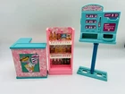 Mattel 1991-1995 Barbie Mini Mart Playset & Vending Machine All 3 items are in great pre-owned condition. From a smoke free home Checkout counter (that is L shaped) is 5.75” in height and was made in 1993. Food shelf is 8” in height and was made in 1991. The vending machine (on a stand) is 11.50” in height and was made in 1995. Shipped via USPS ground advantage.