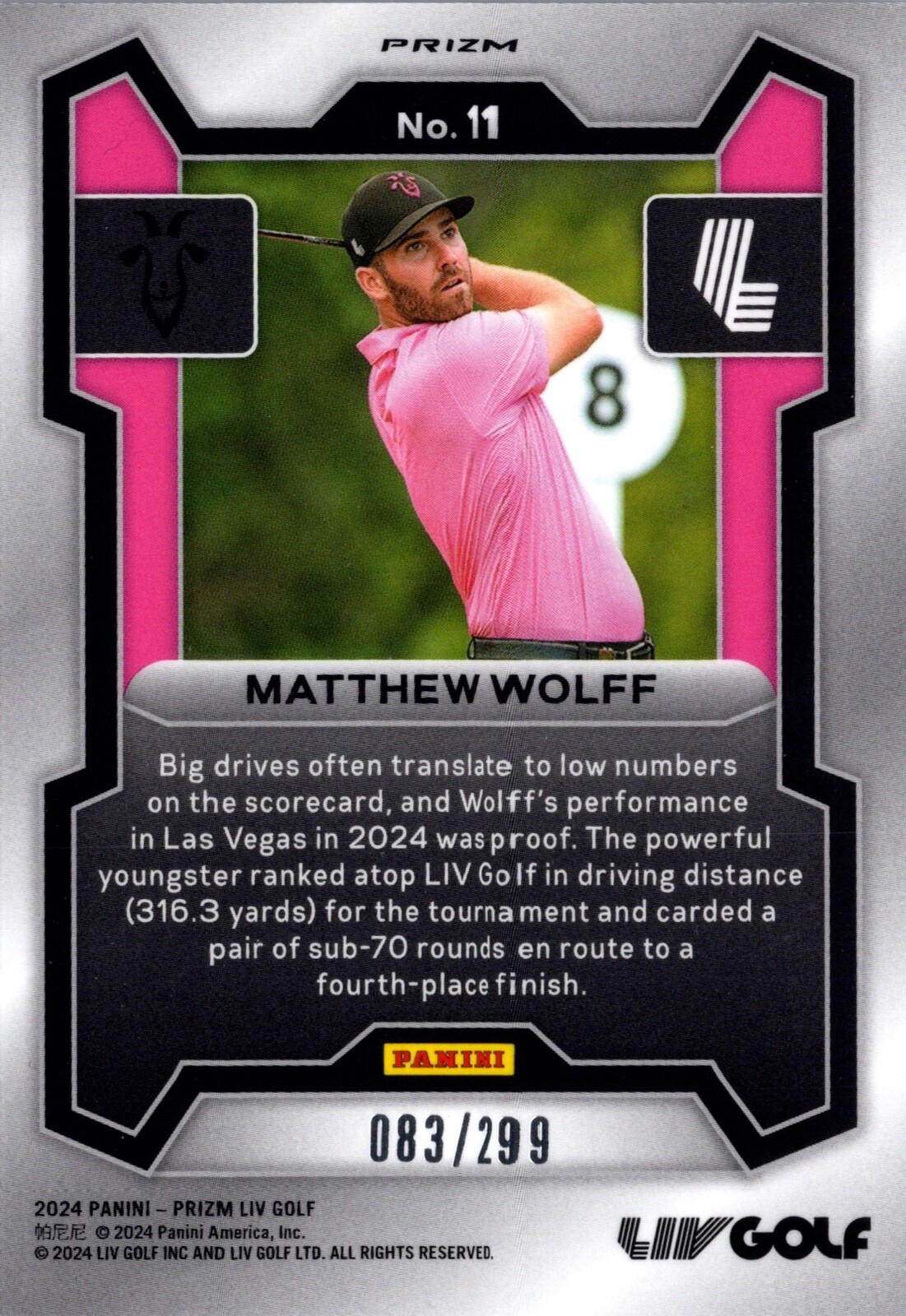 The product is a standard-sized trading card featuring golfer Matthew Wolff from the 2024 Panini Prizm LIV Golf set. This particular card is a Sparkle Prizm parallel with a print run of 083/299. Manufactured by Panini, the card is made of card stock and is an original licensed reprint. The card is not autographed and is part of the LIV league, representing the Rangegoats GC team. It is a sought-after collectible for golf fans and trading card enthusiasts alike.