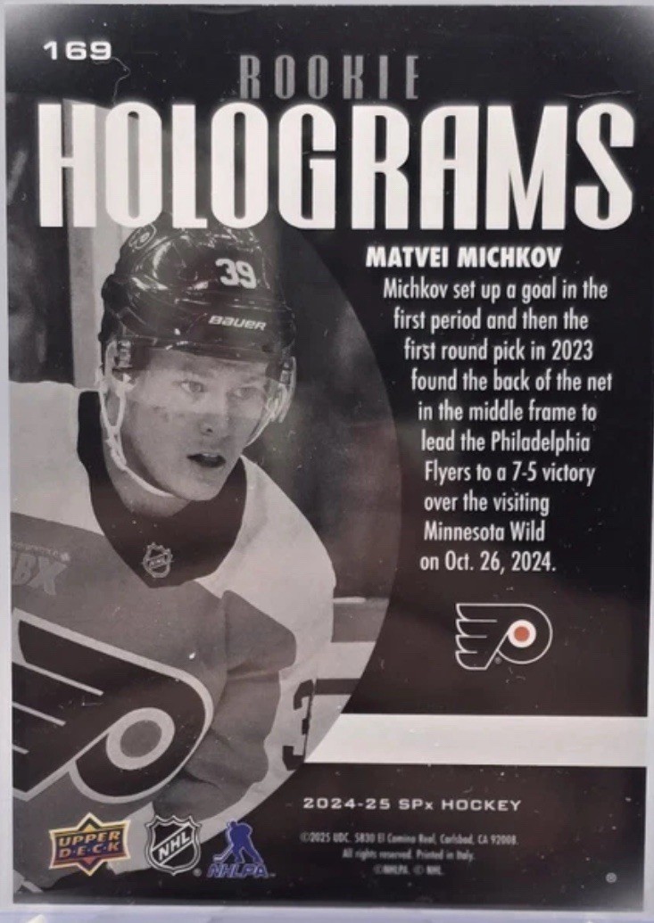 Capture a piece of ice hockey history with this rare Matvei Michkov Rookie Holograms #169 card from the 2024-25 Upper Deck SPX series. This is a super short print card. With its shimmering holographic design, it's a standout addition to any collection. It celebrates Matvei Michkov's rookie status, making it a sought-after card for fans of the sport and collectors of sports trading cards.