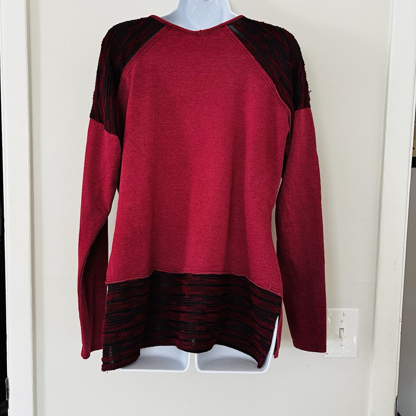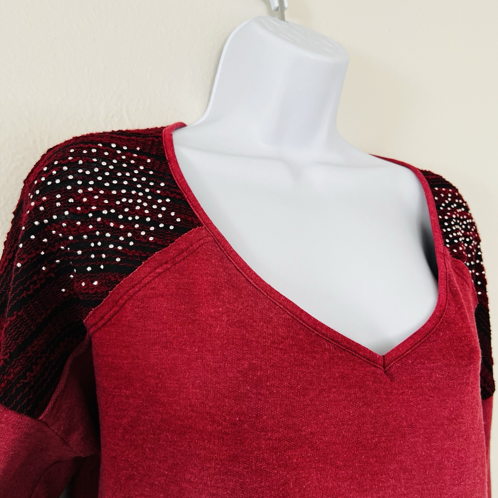 This Maurice's tunic top is a stylish and lightweight option for women, featuring long sleeves and a V-neckline in a rich burgundy red color. The shoulders are embellished with studs, adding a touch of glamour to the casual sleeve design. Made from a blend of polyester and cotton, this tunic offers a comfortable fit in size L. Ideal for the winter, fall, and spring seasons, it can be easily pulled over for a chic and effortless look. See photo(s) for measurements. Color in photos may not be an accurate respresentation of actual color due to lighting. ABOUT ME: • I accept reasonable offers • Next business day shipping • New items posted daily • Smoke free home