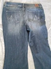 The product is a pair of Maurices women's jeans in size 18 X-short. These solid blue jeans feature a zip and button closure, a medium fabric wash, and a high rise. Made from a cotton blend material, these plus-size jeans have a flared style and an inseam of 28 inches. Perfect for women looking for comfortable and stylish jeans in a smaller size.locbin4326-1/1526