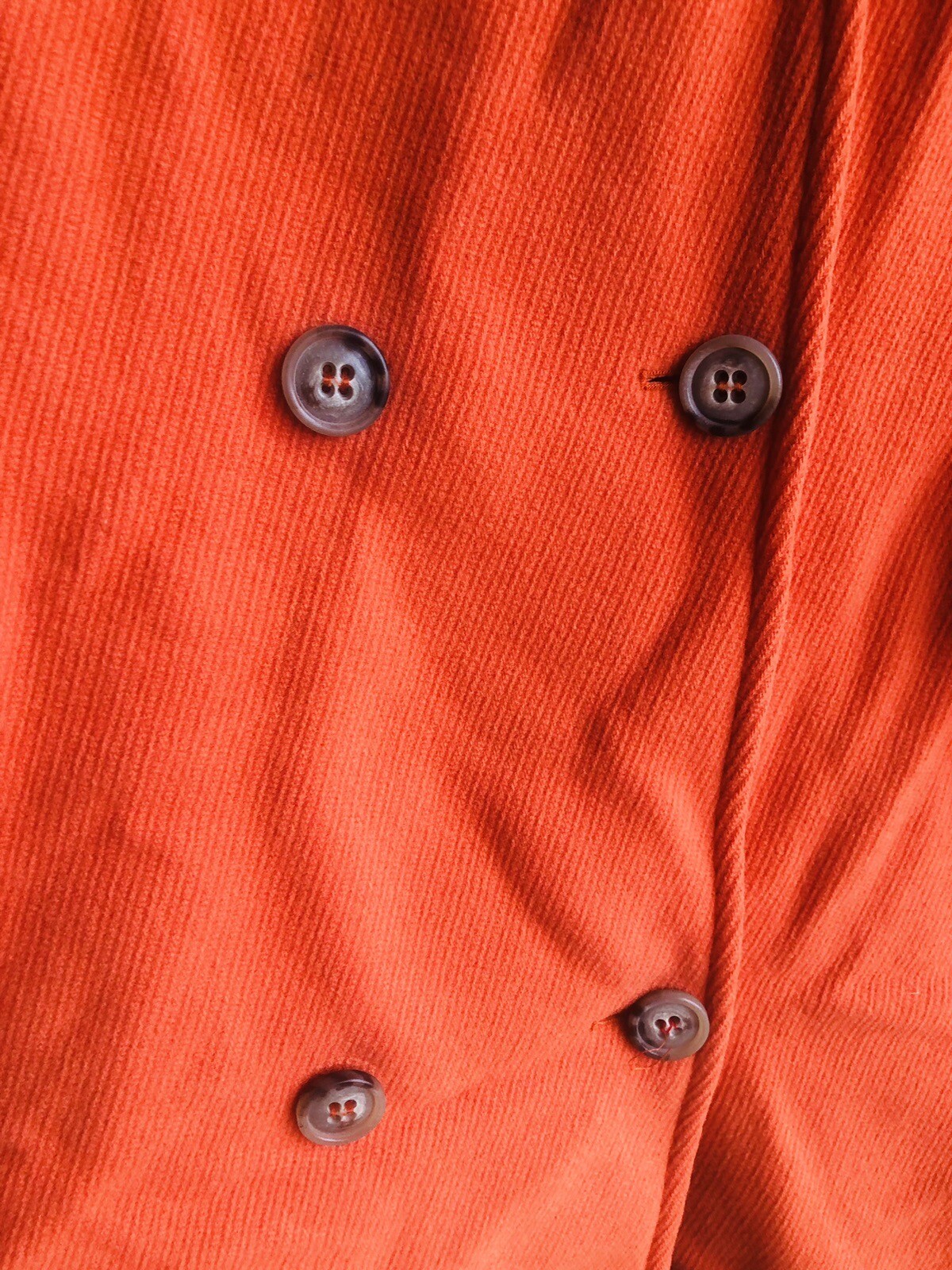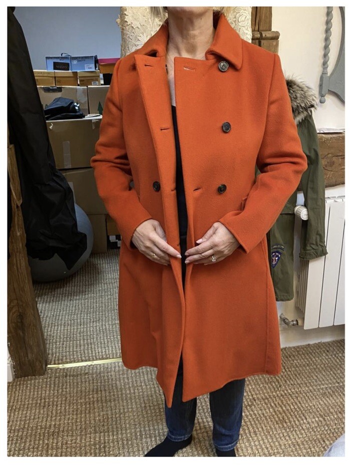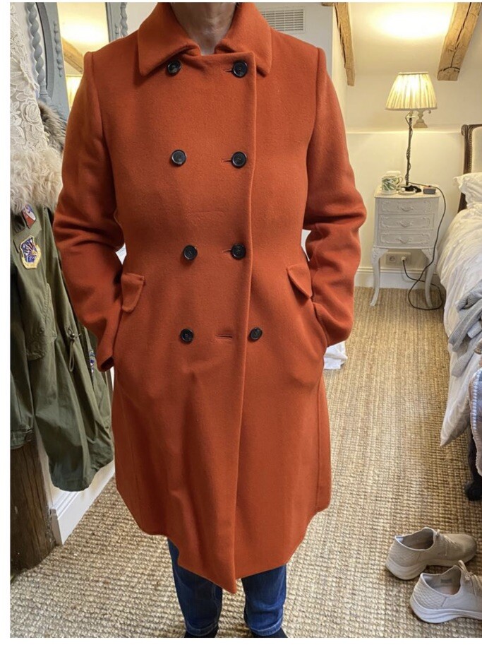 Burnt orange wool knee length coat Unlined two pockets with pleat detail Double breasted with black buttons Has minimal wear, look at the pictures Details Categories :Women Category:Clothing Sub-category:Coats Designer:Max Mara Weekend Condition:Very good conditionMore info Material:Wool Colour:Orange Size:46 ITSize guide Location:France, from the seller Morné Reference:38565439 Bust 21” Length 34.5” Sleeve 22”