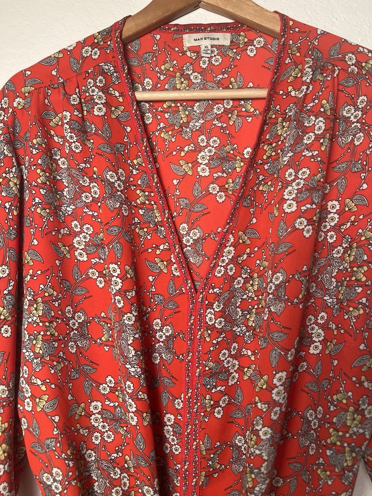 Max Studio wrap-style blouse features a red ditsy print, a clean V-neck , and a tie waist that defines the silhouette beautifully. Long sleeves add polish for work-to-weekend styling. ✧ MEASUREMENTS (inches, laid flat) • Pit to pit: 23" • Length (shoulder to hem): 24" ✧ DETAILS • Brand: Max Studio • Size: Extra Large • Color: Red • Style: Wrap-style blouse / tie-waist top • Neckline: V-neck • Sleeves: Long sleeve • Fabric: 100% Polyester max studio top Xlarge, wrap blouse tie waist, Red floral print blouse, ditsy floral top, geo print wrap top, v neck long sleeve blouse, workwear wrap blouse, boho office top, tie front blouse large, womens xlarge blouse, monochrome print top, polished casual blouse