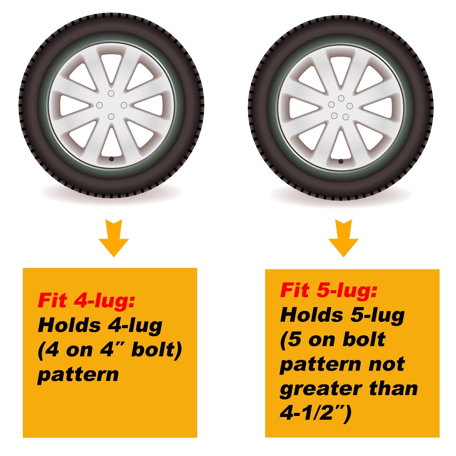 Holds 4-lug (4 on 4" bolt pattern) and 5-lug (5 on 4-1/2" bolt pattern) trailer wheels and not compatible with 5 on 4-3/4" or 5 on 5" bolt pattern Mounts on trailer tongues up to 3 inch wide and 5 inch high Angled and raised mount design makes this ideal for boat trailers as well Durable powder coat finish to resist rust and corrosion Zinc plated mounting hardware
