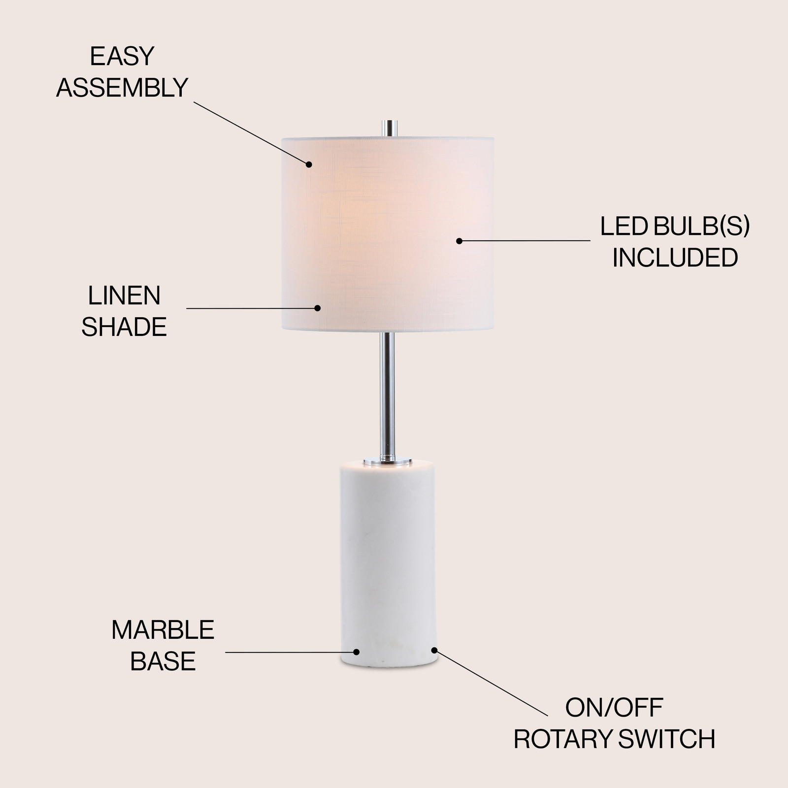 If minimalism vibes with your décor, then you'll find this simple and elegant table lamp the perfect addition to any living space. Weighted by a marble base for stability, it is topped with a linen drum shade to balance proportions and add a soft accent. Finished with chrome fittings and finial, the sleek look extends all the way to the plug -- with a silk-wrapped cord.Features:Marble is always modern, but maybe most so in this minimalist table lamp design The shade is made from 100% cottonThe shade is finished with a matching chrome metal finialOn-off rotary switch on socketEco-friendly 9W LED bulb includedTakes one bulb and compatible with any 9W LED or 60W Type "A" or 13W CFLUL Listed Color: White marble/chrome with white shadeBody Material: MarbleBase Material: MarbleFinial Material: Free Shipping Over $49.99* Details May 25.5" Marble LED Table Lamp, White/Chrome by JONATHAN Y Product Description: If minimalism vibes with your décor, then you'll find this simple and elegant table lamp the perfect addition to any living space. Weighted by a marble base for stability, it is topped with a linen drum shade to balance proportions and add a soft accent. Finished with chrome fittings and finial, the sleek look extends all the way to the plug -- with a silk-wrapped cord. Features: Marble is always modern, but maybe most so in this minimalist table lamp design The shade is made from 100% cotton The shade is finished with a matching chrome metal finial On-off rotary switch on socket Eco-friendly 9W LED bulb included Takes one bulb and compatible with any 9W LED or 60W Type "A" or 13W CFL UL Listed ColorWhite marble/chrome with white shade Body MaterialMarble Base MaterialMarble Finial MaterialMetal Finial ColorChrome Harp ColorSilver IncludesOne (1) lamp(s) Minor Assembly Required Dimensions: Lamp25.5 inches high x 10 inches wide x 10 inches deep Shade9 inches high x 10 inches wide x 10 inches deep About us: You see a lamp. We see a decorative work of art. A perfectly curved shade casts a dramatic shadow on a floor. A silk cord you never want to hide. LED lightbulbs as easy on the environment as they are on the eyes. The JONATHAN Y Lighting collection considers every detail from impeccably sourced materials to designer styling. And our prices are so attractive, we've transformed a functional necessity into a fashion accessory. JONATHAN Y Lighting - a fashion revolution in home decor.
