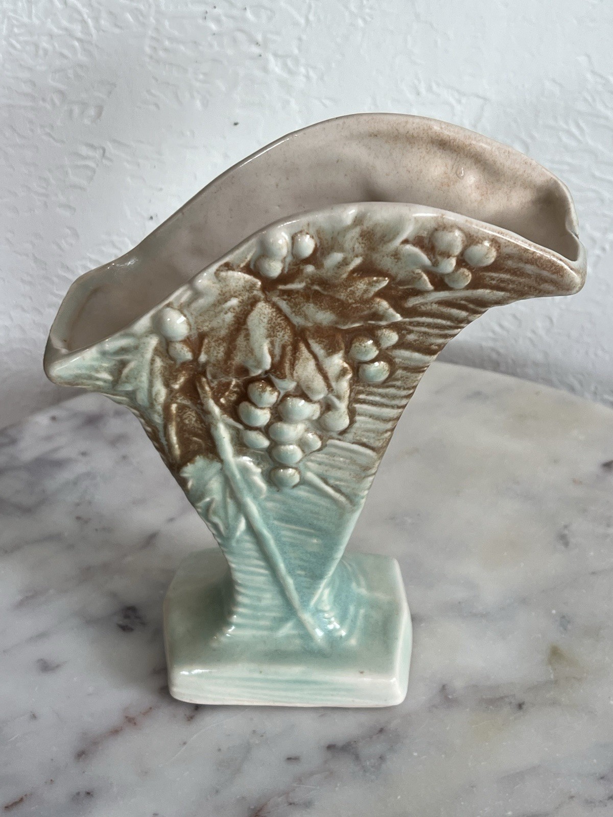 The McCoy Pottery Fan Vase with a Grapes and Leaves design is a vintage collectible piece that exudes Art Deco style. This medium-sized ceramic vase features a unique asymmetrical shape and a glazed finish, giving it a 3D effect that adds visual interest. The greenish/blue-brown color palette adds a touch of elegance to any space, making it a perfect decorative piece for collectors or art enthusiasts. Made in the United States, this vase is a charming addition to any vintage-inspired decor collection. No chips or cracks