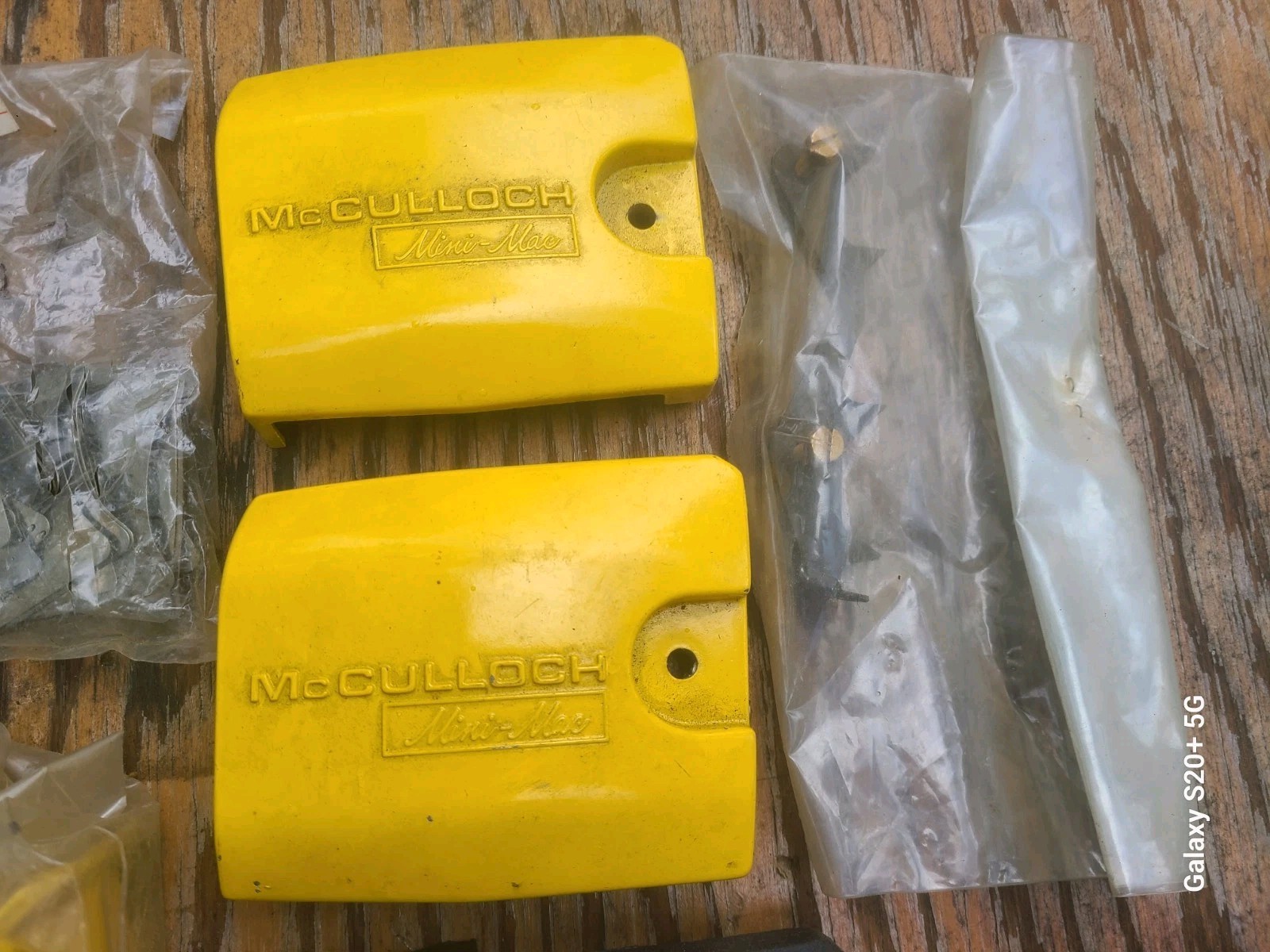 This listing is for the lot of mcculloch mini mac parts. There are covers and 31 nos bar plates. Some items have shelf wear. These parts came out of an old chainsaw shop that was cleaned out several years ago. Please feel free to ask questions, and thank you for looking..