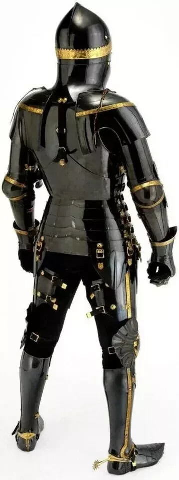 Medieval Knight Wearable Suit Of Armor Crusader Full Body Armour Suit Free Black Base & Iron Stand Light Weight Armor & Its fully wearable and comfortably made. Premium quality well made Medieval Knight Suit Of Armor Size : XL Men's Metal : Steel - 20 Gauge Finish: As shown in Picture Full Size reproduction Handcrafted : Steel and Iron construction Height: 200 cm - 79 inches Weight with wooden base and stand: 25 kg (approx.) Made of high quality Steel & Iron 20 Gauge High Splendid Finishing. Best leather gloves inside. High quality leather straps. With beautiful on front side This Armour suit can be worn or used for Display. Suit Is Fully Wearable Packing and Assembling Details We First Check Armour Suit 2 Time Before Packing So That There Is No Chance Of Any Problem And Damage Or Scratches And Then We Pack It , Little Assemble Requires It Will Not Take That Much Time To Assemble The Armour It So Easy If Any Problem Came We Will Send Video And We Will Help Our Buyer With Everything Little Assembly Required For Suit And Wooden Base We Will Share Video Links For Instruction if You Need Any Help Not Sold as an Antique This is Reproduction Handmade Product Made by Indian Handicraft We supply this armor Suit pre oiled for protection from rust. use this shield as a great Halloween costume please note : this is a hand-made item & slight difference in color and size are possible. We supply this armor pre oiled / greased for protection from rust. you are requested to please wipe this item with soft cotton cloth before start using it. and if you have no use this item then please re-apply simple mobile/lube on this item and pack it in a plastic bag. -Usage : Home Decorative,Desktop Decorative.Table Decorative Collectible Items -Packing : Packing In One Parcels. Corrugated Export Packing