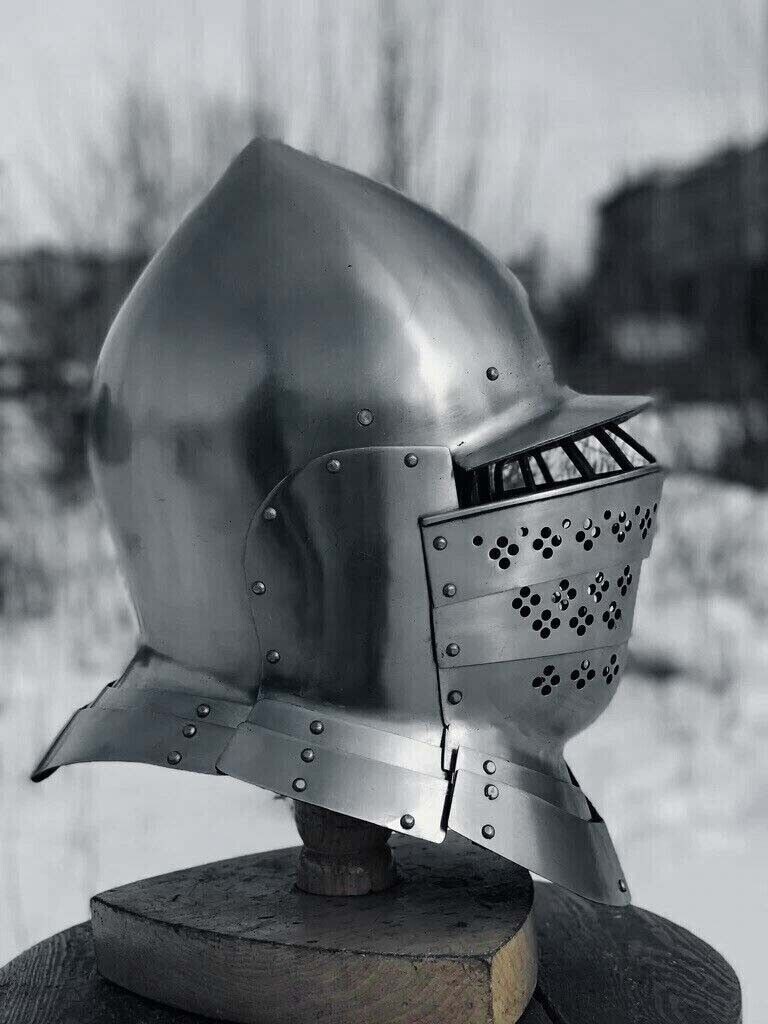 SCA Medieval Combat Burgonet Helmet Knight Armor HMB reenactment Made from mild steel Easy fit to adult Comfortable to wear chin strap is given to hold it on head during movement Leather liner is used inside the helmet Front to back:- 9 inches (23 cm) Ear to Ear:- 8 inches (19 cm) Circumference:- 26 inches (67 cm) Weight:- 4 Kg Sheet Thickness:- 14 Gauge (2 mm) Size:- Standard size, fits almost all adults NOTE----ALL CUSTOM DUTY WILL BE PAID BY THE BUYER IN HIS COUNTRY ,