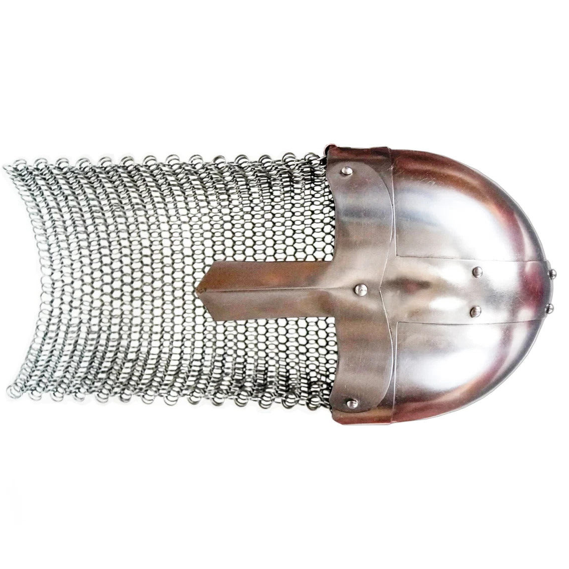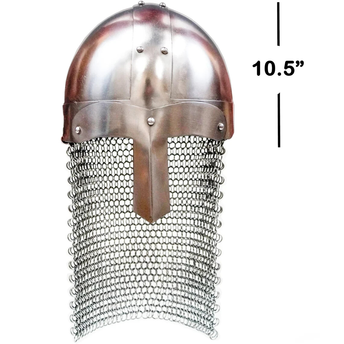 Handmade Materials: iron This classic Norman Nasal Helmet is the same design of many of our Norman helmets but features a steel, butted chainmail agential attached to the helmet. Historically it was for added protection on the back of the neck in battle This is helmet is impressive and superbly constructed and is sure to be a highlight of your collection. Comes unlined but is fully wearable. You may purchase an arming cap separately or put in your own padding for a custom snug fit. This helmet is great for costumes, collection for display, and role-playing events. Mild Steel Helmet Steel Chainmail agential Full sized and wearable Will make an excellent quality costume or redactors piece Luxury Wooden Stand not included Specifications: Dimensions: L: 8.75in x W: 9.5in x H: 17in Weight: 4.70lbs THANKS