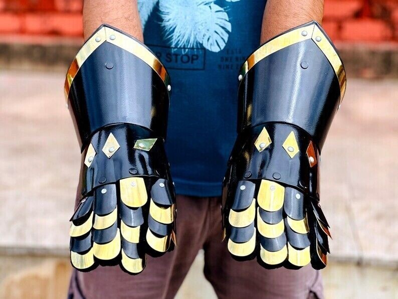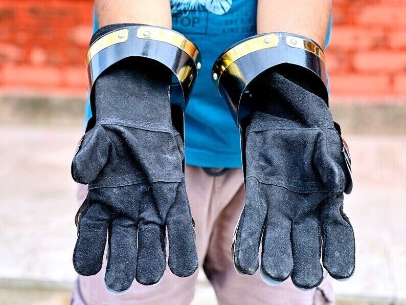 PRODUCT FEATURES: Medieval Crusader Steel | Functional Armor Gloves | Gauntlets for Combat | Reenactment SCA Knight Gauntlets | Best Gift For Christmas Size; XL (Fit almost adults) * Length: 15 inch (approx.) * Weight: 2 kg (approx.) * Metal : High Quality 18 Gauge Steel * Finish: Silver Finish As shown as picture * All items are coated with rust-free paint from inside. * All belts are made of sturdy brown or black leather. * Edges of every item detail are carefully rolled. Finish: As shown in Picture Full Size reproduction An Impressive interior decor piece and collector item Best for Reenactment, Role-Play and SCA Best for Costume pairing with helmets, armor suit etc Thanks for Shopping