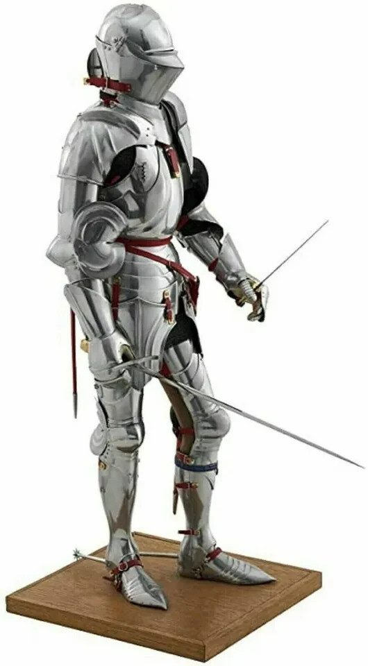 Full Suit of Armour Wearable Medieval Knight Full Suit of Armor Steel Templar Item description from the seller WELCOME TO THE STORE Features: FREE wooden base with this armour suit Premium quality well made Medieval Knight Suit Of Armor Metal : Steel Finish: Silver Polish as shown in Picture Full Size reproduction; Handcrafted : Steel and Iron construction with "old patina" finish Height: 6 Feet Weight: 97 lbs An Impressive interior decor piece and collector item Inlude swords or any other weapon ???Merry Christmas???
