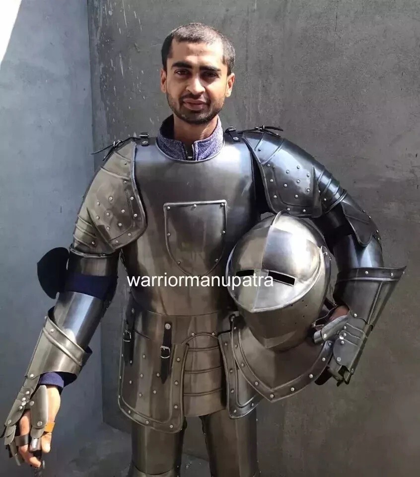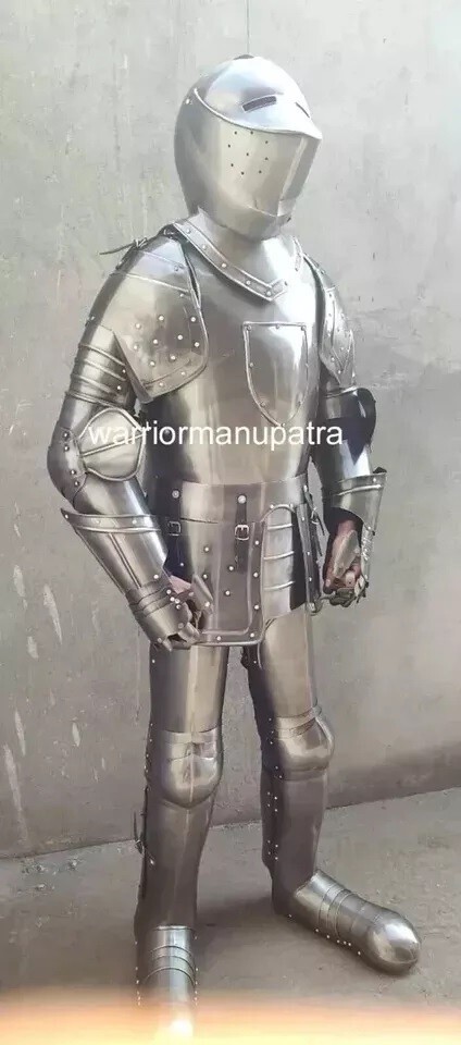 Medieval Knight Wearable Suit Of Armor Crusader Full Body Armour Suit Free Black Base & Iron Stand Light Weight Armor & Its fully wearable and comfortably made. Premium quality well made Medieval Knight Suit Of Armor Size : XL Men's Metal : Steel - 20 Gauge Finish: As shown in Picture Full Size reproduction Handcrafted : Steel and Iron construction Height: 200 cm - 79 inches Weight with wooden base and stand: 25 kg (approx.) Made of high quality Steel & Iron 20 Gauge High Splendid Finishing. Best leather gloves inside. High quality leather straps. With beautiful on front side This Armour suit can be worn or used for Display. Suit Is Fully Wearable Packing and Assembling Details We First Check Armour Suit 2 Time Before Packing So That There Is No Chance Of Any Problem And Damage Or Scratches And Then We Pack It , Little Assemble Requires It Will Not Take That Much Time To Assemble The Armour It So Easy If Any Problem Came We Will Send Video And We Will Help Our Buyer With Everything Little Assembly Required For Suit And Wooden Base We Will Share Video Links For Instruction if You Need Any Help Not Sold as an Antique This is Reproduction Handmade Product Made by Indian Handicraft We supply this armor Suit pre oiled for protection from rust. use this shield as a great Halloween costume please note : this is a hand-made item & slight difference in color and size are possible. We supply this armor pre oiled / greased for protection from rust. you are requested to please wipe this item with soft cotton cloth before start using it. and if you have no use this item then please re-apply simple mobile/lube on this item and pack it in a plastic bag. -Usage : Home Decorative,Desktop Decorative.Table Decorative Collectible Items -Packing : Packing In One Parcels. Corrugated Export Packing