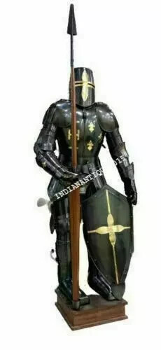 Crusader Suit of Armor With Medieval Shield, Tunic & Sword Great For LARP, Halloween, Theatrical Play, Fantasy, Historical Reenactments Height: 200 cms - 79 inches ( stand is NOT part of sale) An Impressive interior decor piece and collector item Medieval suits of armor were created in order to protect the knights during battle and make them more efficient warriors. There were three types of fighting men during the middle ages known as Knights, Foot Soldiers, and Archers. Suit of armor usually consists of the helmet breastplate & backplate, gauntlets, pauldrons (or shoulders), vambraces, couters, sabatons (foot armor), greaves (to protect shins). Crusader Helmet Has small slits for eyes and breathing/ventilation which may be decorative as well as functional. Covers the breast and the back, however the name is sometimes used to describe the breast- and backplates together. Gloves that cover from the fingers to the forearms, These medieval pauldrons can easily suit the needs of LARP to medieval re-enactment groups. Sabaton covers the foot, This knight suit of armor Manufactured