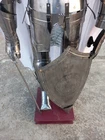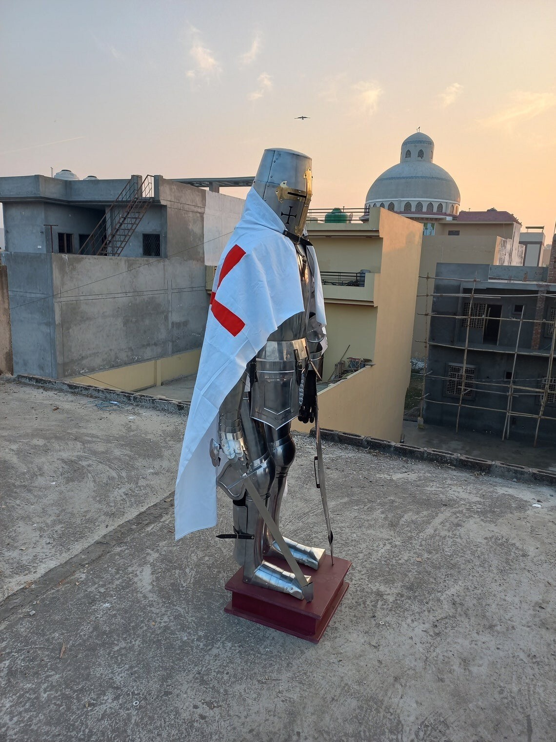 Medieval Knight Wearable Suit Of Armor Crusader Full Body Armour Suit Free Black Base & Iron Stand Sword,Shield and Cape Is Included With The Armor Light Weight Armor & Its fully wearable and comfortably made. Premium quality well made Medieval Knight Suit Of Armor Size : XL Men's Metal : Steel - 20 Gauge Finish: As shown in Picture Full Size reproduction Handcrafted : Steel and Iron construction Height: 200 cm - 79 inches Weight with wooden base and stand: 25 kg (approx.) Made of high quality Steel & Iron 20 Gauge High Splendid Finishing. Best leather gloves inside. High quality leather straps. With beautiful on front side This Armour suit can be worn or used for Display. Suit Is Fully Wearable Packing and Assembling Details We First Check Armour Suit 2 Time Before Packing So That There Is No Chance Of Any Problem And Damage Or Scratches And Then We Pack It , Little Assemble Requires It Will Not Take That Much Time To Assemble The Armour It So Easy If Any Problem Came We Will Send Video And We Will Help Our Buyer With Everything Little Assembly Required For Suit And Wooden Base We Will Share Video Links For Instruction if You Need Any Help Not Sold as an Antique This is Reproduction Handmade Product Made by Indian Handicraft We supply this armor Suit pre oiled for protection from rust. use this shield as a great Halloween costume please note : this is a hand-made item & slight difference in color and size are possible. We supply this armor pre oiled / greased for protection from rust. you are requested to please wipe this item with soft cotton cloth before start using it. and if you have no use this item then please re-apply simple mobile/lube on this item and pack it in a plastic bag. -Usage : Home Decorative,Desktop Decorative.Table Decorative Collectible Items -Packing : Packing In One Parcels. Corrugated Export Packing