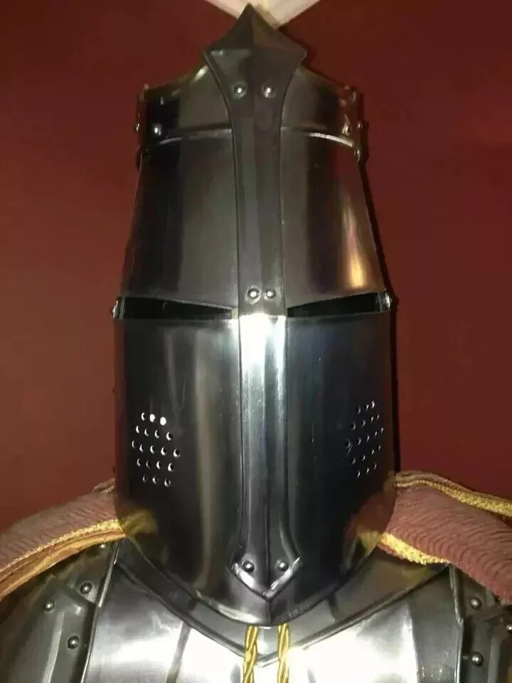 Medieval Knight Wearable Suit Of Armor Crusader Full Body Armour Suit Light Weight Armor & Its fully wearable and comfortably made. Sword Will Come Different Please Note Premium quality well made Medieval Knight Suit Of Armor Size : XL Men's Metal : Steel - 20 Gauge Finish: As shown in Picture Full Size reproduction Handcrafted : Steel and Iron construction Height: 200 cm - 79 inches Weight with wooden base and stand: 25 kg (approx.) Made of high quality Steel & Iron 20 Gauge High Splendid Finishing. Best leather gloves inside. High quality leather straps. With beautiful on front side This Armour suit can be worn or used for Display. Suit Is Fully Wearable Packing and Assembling Details We First Check Armour Suit 2 Time Before Packing So That There Is No Chance Of Any Problem And Damage Or Scratches And Then We Pack It , Little Assemble Requires It Will Not Take That Much Time To Assemble The Armour It So Easy If Any Problem Came We Will Send Video And We Will Help Our Buyer With Everything Little Assembly Required For Suit And Wooden Base We Will Share Video Links For Instruction if You Need Any Help Not Sold as an Antique This is Reproduction Handmade Product Made by Indian Handicraft We supply this armor Suit pre oiled for protection from rust. use this shield as a great Halloween costume please note : this is a hand-made item & slight difference in color and size are possible. We supply this armor pre oiled / greased for protection from rust. you are requested to please wipe this item with soft cotton cloth before start using it. and if you have no use this item then please re-apply simple mobile/lube on this item and pack it in a plastic bag. -Usage : Home Decorative,Desktop Decorative.Table Decorative Collectible Items -Packing : Packing In One Parcels. Corrugated Export Packing