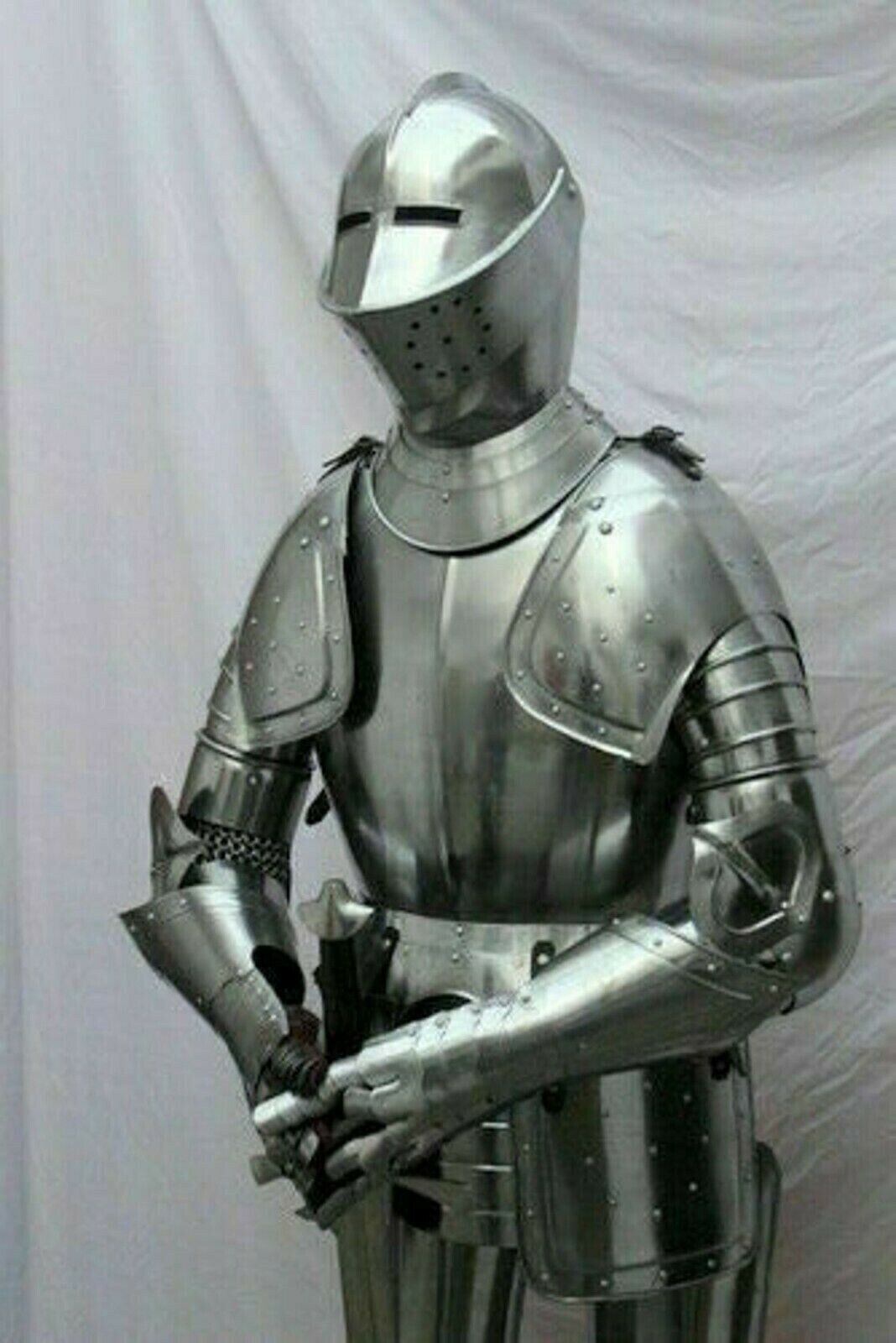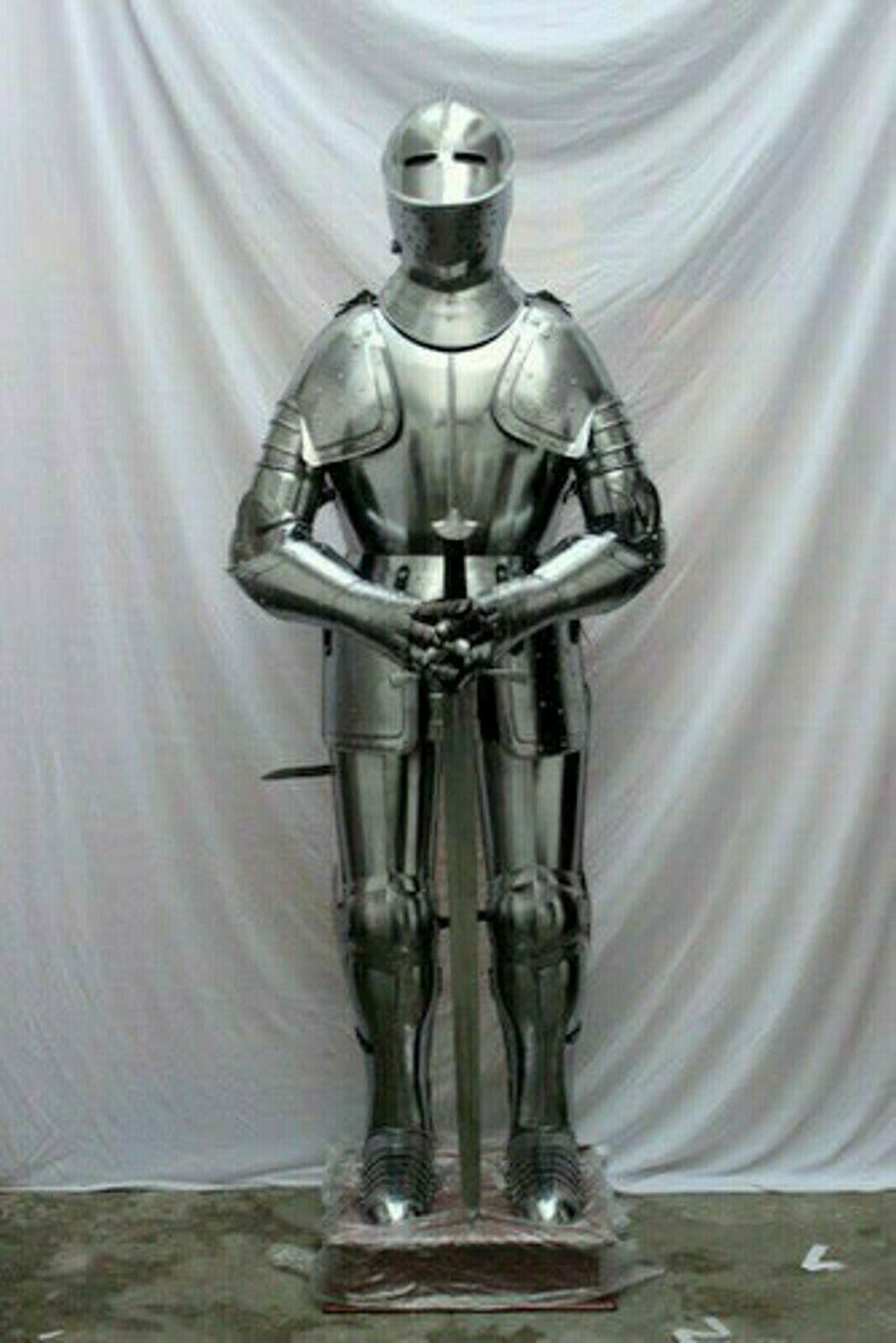 DESCRIPTION Handmade Materials Steel-18 Gauge, Wooden Size XL Men's Premium quality well made Medieval Knight Suit Of Armor Metal : Steel and Leather Finish: Finish as shown in Picture Full Size reproduction; Handcrafted : Steel and Iron construction with polish finish Height: 6 Feet (approx) Weight with wooden base and stand: 38 kg (approx) You can explore our exclusive range of Armor Accessories collections like: Armor Gauntlets/ Armor Helmets/ Armor Shields/ Armor Swords/ Armor Chest Plate/ Armor full suit and much more. This is a Reproduction/Replica Item, Not Sold As Antique. If you have any questions please write to me. Thanks!!! If You Can Not Find Your Favourite Item In My Shop , You Could Also Send Me The Picture Or Linking Of Which You'd Like. We Can Make The Item According To That. We Make A Promise That We Will Use The Best Material For The Item. World Wide Fast Delivery. Thanks For Shopping.