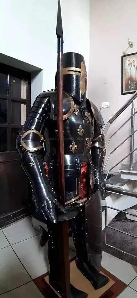 Medieval Knight Wearable Suit Of Armor Crusader Full Body Armour Suit Free Black Base & Iron Stand Spear, Shield and Cape Is Included With The Armor Please Note-(we Can make custom design on shield as per your choice ) Light Weight Armor & Its fully wearable and comfortably made. Premium quality well made Medieval Knight Suit Of Armor Size : XL Men's Metal : Steel - 20 Gauge Finish: As shown in Picture Full Size reproduction Handcrafted : Steel and Iron construction Weight with wooden base and stand: 25 kg (approx.) Made of high quality Steel & Iron 20 Gauge High Splendid Finishing. Best leather gloves inside. High quality leather straps. With beautiful on front side This Armour suit can be worn or used for Display. Suit Is Fully Wearable Packing and Assembling Details We First Check Armour Suit 2 Time Before Packing So That There Is No Chance Of Any Problem And Damage Or Scratches And Then We Pack It , Little Assemble Requires It Will Not Take That Much Time To Assemble The Armour It So Easy If Any Problem Came We Will Send Video And We Will Help Our Buyer With Everything Little Assembly Required For Suit And Wooden Base We Will Share Video Links For Instruction if You Need Any Help Not Sold as an Antique This is Reproduction Handmade Product Made by Indian Handicraft We supply this armor Suit pre oiled for protection from rust. use this shield as a great Halloween costume please note : this is a hand-made item & slight difference in color and size are possible. We supply this armor pre oiled / greased for protection from rust. you are requested to please wipe this item with soft cotton cloth before start using it. and if you have no use this item then please re-apply simple mobile/lube on this item and pack it in a plastic bag. -Usage : Home Decorative,Desktop Decorative.Table Decorative Collectible Items -Packing : Packing In One Parcels. Corrugated Export Packing