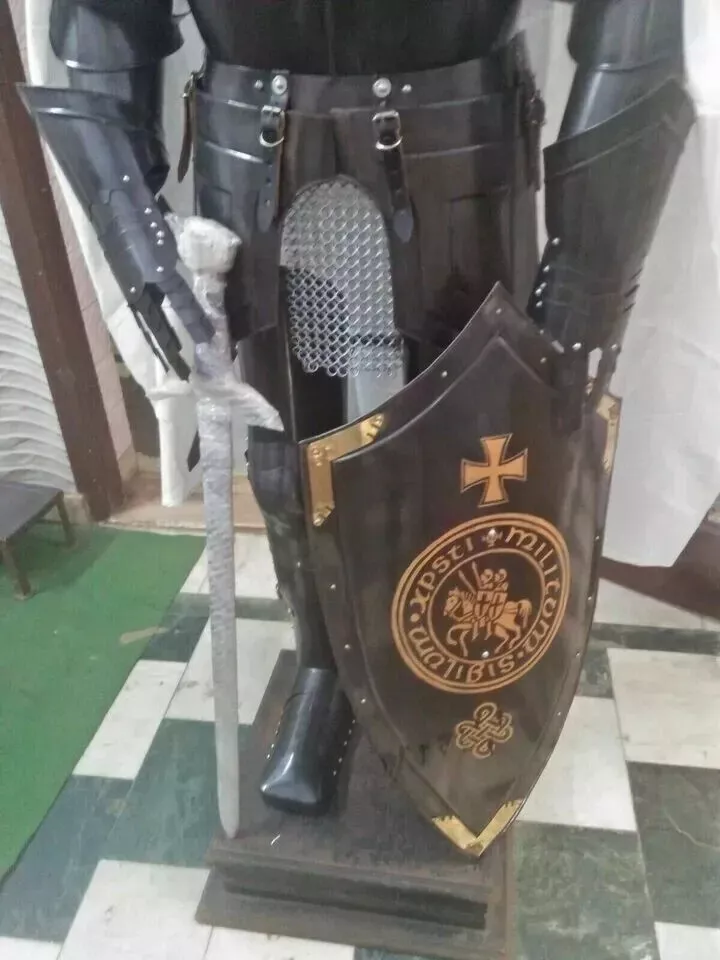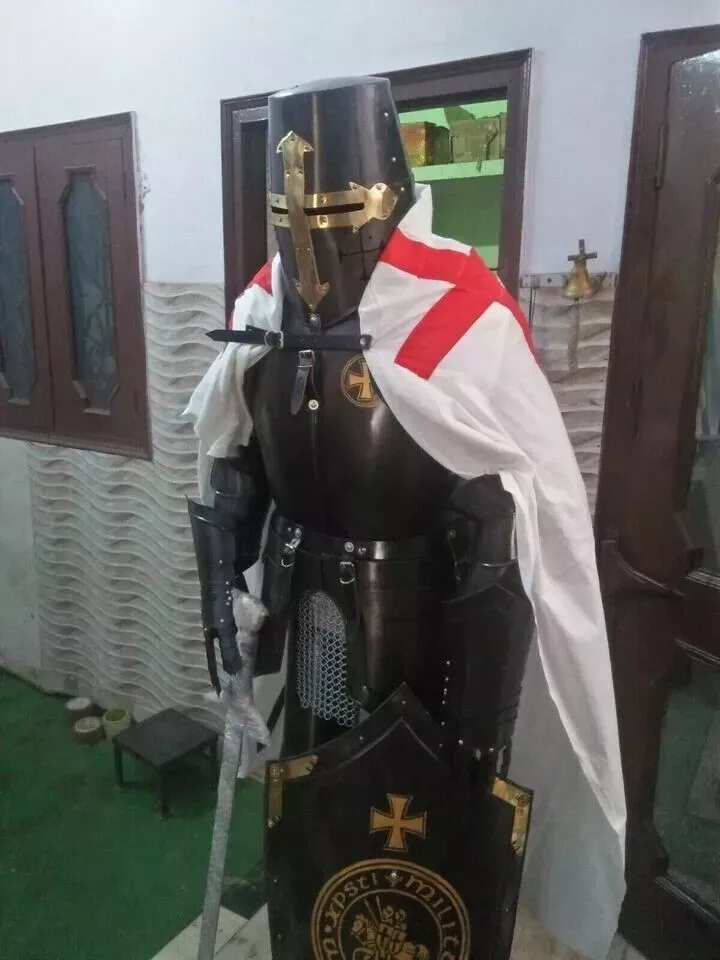 Medieval Knight Wearable Suit Of Armor Crusader Full Body Armour Suit Free Black Base & Iron Stand Sword,Shield and Cape Is Included With The Armor Light Weight Armor & Its fully wearable and comfortably made. Premium quality well made Medieval Knight Suit Of Armor Size : XL Men's Metal : Steel - 20 Gauge Finish: As shown in Picture Full Size reproduction Handcrafted : Steel and Iron construction Height: 200 cm - 79 inches Weight with wooden base and stand: 25 kg (approx.) Made of high quality Steel & Iron 20 Gauge High Splendid Finishing. Best leather gloves inside. High quality leather straps. With beautiful on front side This Armour suit can be worn or used for Display. Suit Is Fully Wearable Packing and Assembling Details We First Check Armour Suit 2 Time Before Packing So That There Is No Chance Of Any Problem And Damage Or Scratches And Then We Pack It , Little Assemble Requires It Will Not Take That Much Time To Assemble The Armour It So Easy If Any Problem Came We Will Send Video And We Will Help Our Buyer With Everything Little Assembly Required For Suit And Wooden Base We Will Share Video Links For Instruction if You Need Any Help Not Sold as an Antique This is Reproduction Handmade Product Made by Indian Handicraft We supply this armor Suit pre oiled for protection from rust. use this shield as a great Halloween costume please note : this is a hand-made item & slight difference in color and size are possible. We supply this armor pre oiled / greased for protection from rust. you are requested to please wipe this item with soft cotton cloth before start using it. and if you have no use this item then please re-apply simple mobile/lube on this item and pack it in a plastic bag. -Usage : Home Decorative,Desktop Decorative.Table Decorative Collectible Items -Packing : Packing In One Parcels. Corrugated Export Packing