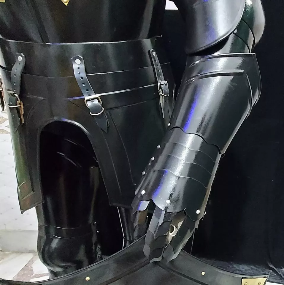 Medieval Knight Wearable Suit Of Armour Crusader Full Body Armour Suit Free Black Base & Iron Stand Spear, Shield Is Included With This Armour Light Weight Armour & Its fully wearable and comfortably made. Premium quality well made Medieval Knight Suit Of Armour Size : XL Men's Metal : Steel - 20 Gauge Finish: As shown in Picture Full Size reproduction Handcrafted : Steel and Iron construction Height: 200 cm - 79 inches Weight with wooden base and stand: 25 kg (approx.) Made of high quality Steel & Iron 20 Gauge High Splendid Finishing. Best leather gloves inside. High quality leather straps. With beautiful on front side This Armour suit can be worn or used for Display. Suit Is Fully Wearable Packing and Assembling Details We First Check Armour Suit 2 Time Before Packing So That There Is No Chance Of Any Problem And Damage Or Scratches And Then We Pack It , Little Assemble Requires It Will Not Take That Much Time To Assemble The Armour It So Easy If Any Problem Came We Will Send Video And We Will Help Our Buyer With Everything Little Assembly Required For Suit And Wooden Base We Will Share Video Links For Instruction if You Need Any Help Not Sold as an Antique This is Reproduction Handmade Product Made by Indian Handicraft We supply this armor Suit pre oiled for protection from rust. use this shield as a great Halloween costume please note : this is a hand-made item & slight difference in color and size are possible. We supply this armor pre oiled / greased for protection from rust. you are requested to please wipe this item with soft cotton cloth before start using it. and if you have no use this item then please re-apply simple mobile/lube on this item and pack it in a plastic bag. -Usage : Home Decorative,Desktop Decorative.Table Decorative Collectible Items -Packing : Packing In One Parcels. Corrugated Export Packing