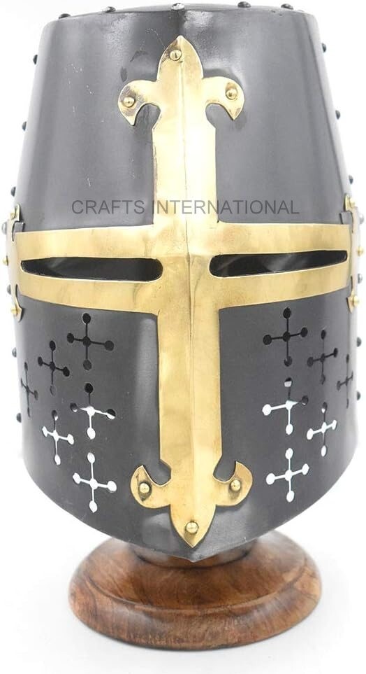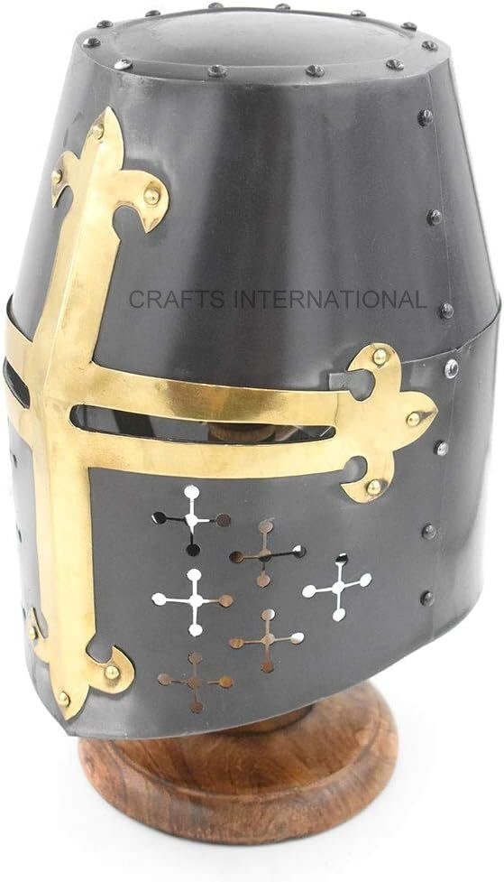 Medieval Warrior Templar Brass Crusader Helmet Knights Helmet | Wearable for Adult | Medieval Costumes | FREE STAND About this item ✔️.PREMIUM QUALITY KNIGHT MEDIEVAL CRUSADER HELMET : A Great part of Crusader Era is this Crusades Helmet . It was an immense part of Crusader Knight Costumes and Outfit in Medieval War Time . So Buy it with confidence and Feel the Fire of a Crusader . ✔️ PERFECT SIZE & MULTIPLE USAGE : This is a Fully Wearable Handcrafted Crusader Armor Helmet . Made from 18 Guage mild steel with solid brass accents. Inner diameter front to back 9'inch. Ear to ear 8' inch, inches Height : 13.5 inches, from top to bottom Circumference : 26 inches suitable for every Standard Adult .Can be used it in multi ways like it is Great Gift Idea for Halloween Party, Perfect and Unique Birthday Gifts for your Boy Friend , Husband or Father and Brothers . Best for Party ✔️METAL CRUSADERS HELMET WITH FITTED LEATHER LINER AND CHIN STRAPS:- Our Metal Crusades Helmets comes with Fitted Flux Leather Liner & Adustable Chinstrap which provides Great Comfort to our Crusaders Knights in Larp Re-enactment Renaissance Party and Cosplay ✔️ ONE CRUSADER HELMET MANY NAMES: This Metal Helmet is called by many names in this era like Dark Crusader Helmet , Holy Crusader Helmet , Steel Combat Crusader Helmet , Templar Knight Crusader Helmet. ✔️ SATISFACTION GUARANTEE: We provide Life time warrantee and 30 Days full Money Back Guarantee if there is any Manufacturing Defect in our Helmet .So Buy with Confidence.