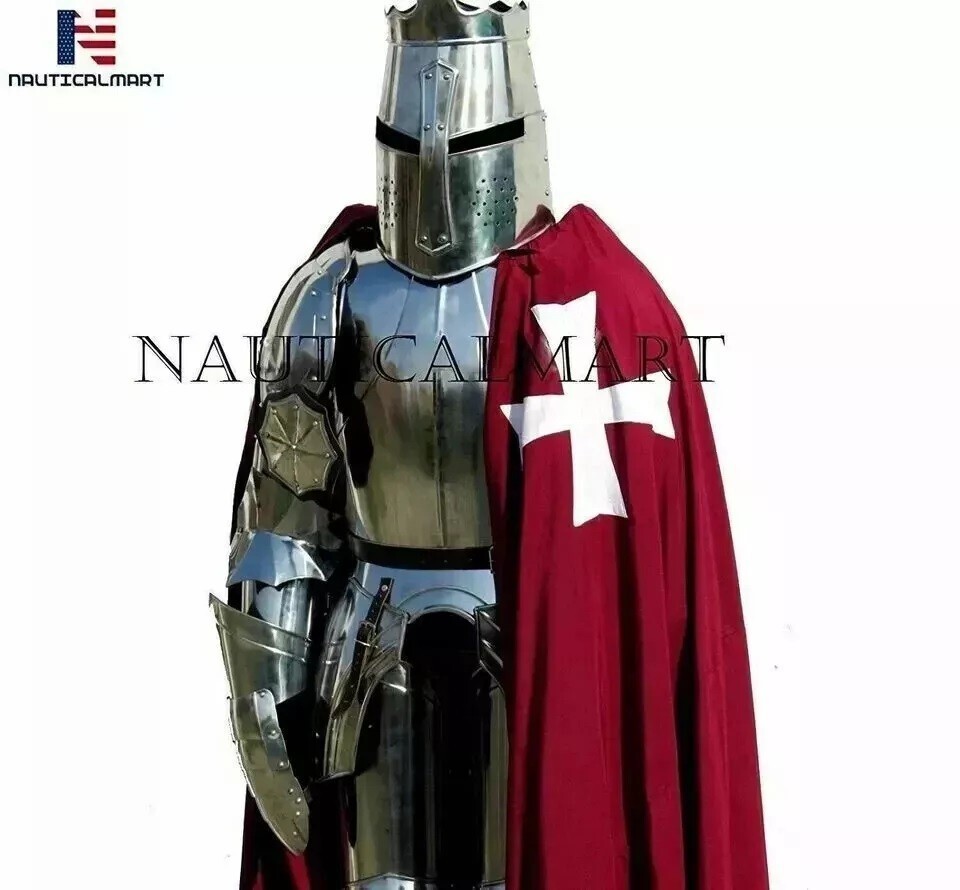 Medieval Knight Wearable Suit Of Armor Crusader Full Body Armour Suit Free Black Base & Iron Stand Shield and Cape Is Included With The Armor Please Note-(we Can make custom design on shield as per your choice ) Light Weight Armor & Its fully wearable and comfortably made. Premium quality well made Medieval Knight Suit Of Armor Size : XL Men's Metal : Steel - 20 Gauge Finish: As shown in Picture Full Size reproduction Handcrafted : Steel and Iron construction Weight with wooden base and stand: 25 kg (approx.) Made of high quality Steel & Iron 20 Gauge High Splendid Finishing. Best leather gloves inside.High quality leather straps.With beautiful on front side This Armour suit can be worn or used for Display. Suit Is Fully Wearable