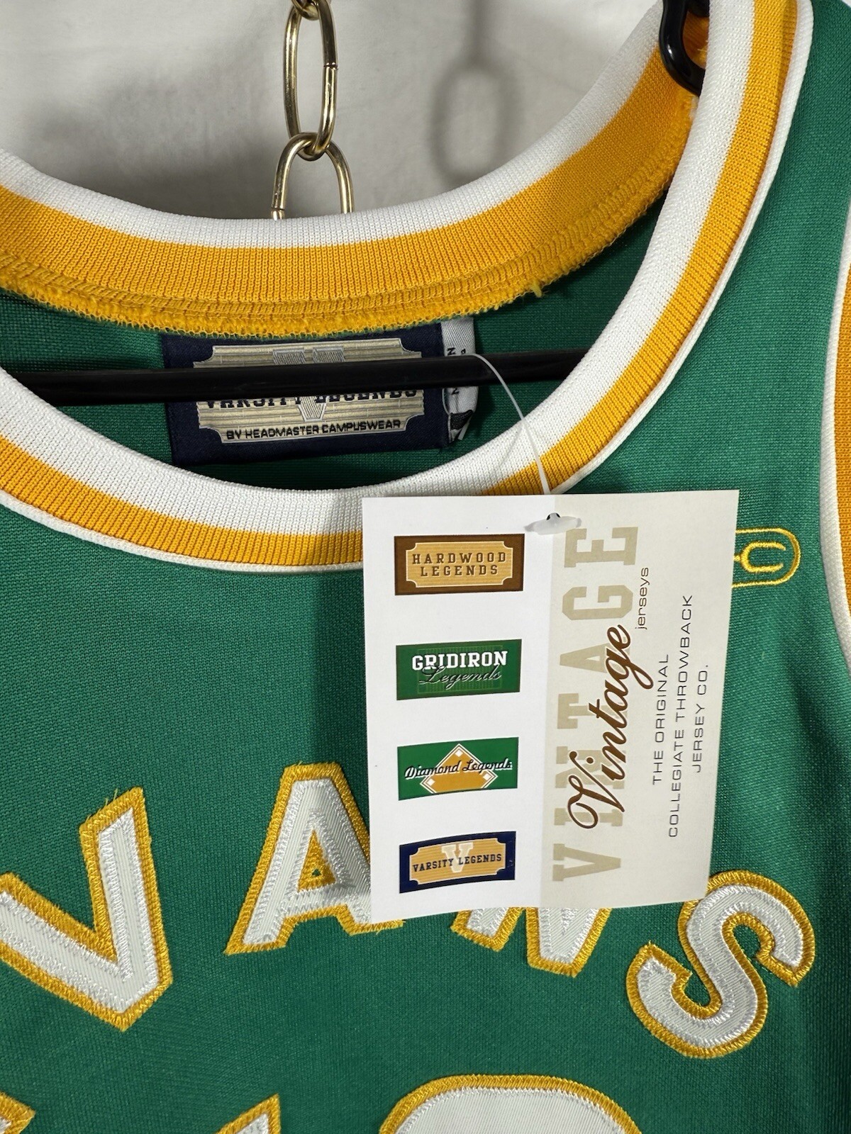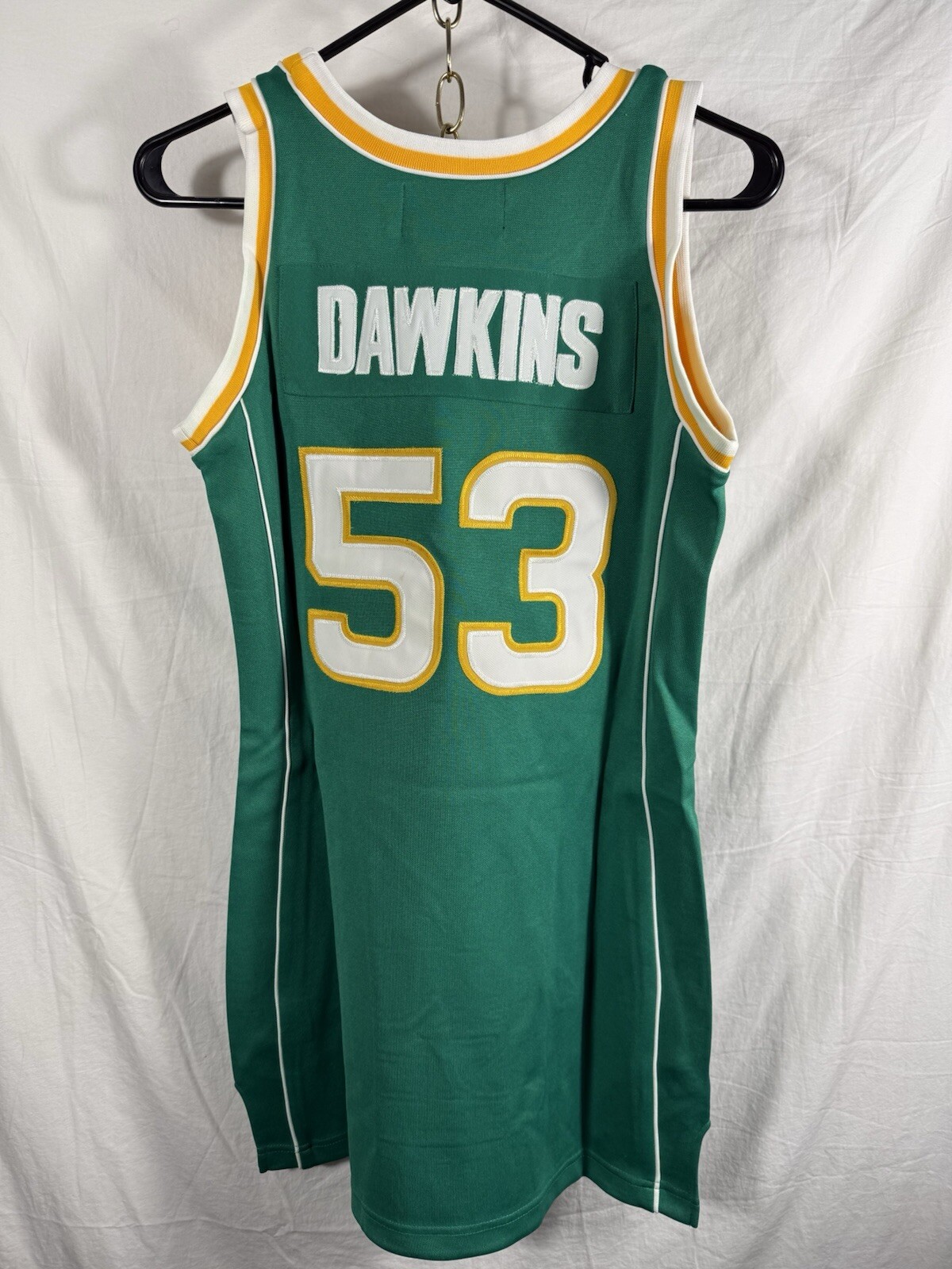The product is a small size Darryl Dawkins Evans High School cheerleading dress in green color. It is officially licensed by Varsity Legends and features the player's name on the front. The dress is part of the National Basketball Association (NBA) collection, specifically designed for women fans of the team. This vintage dress is brand new with tags, making it a unique and collectible item for fans of both Darryl Dawkins and Evans High School basketball.