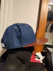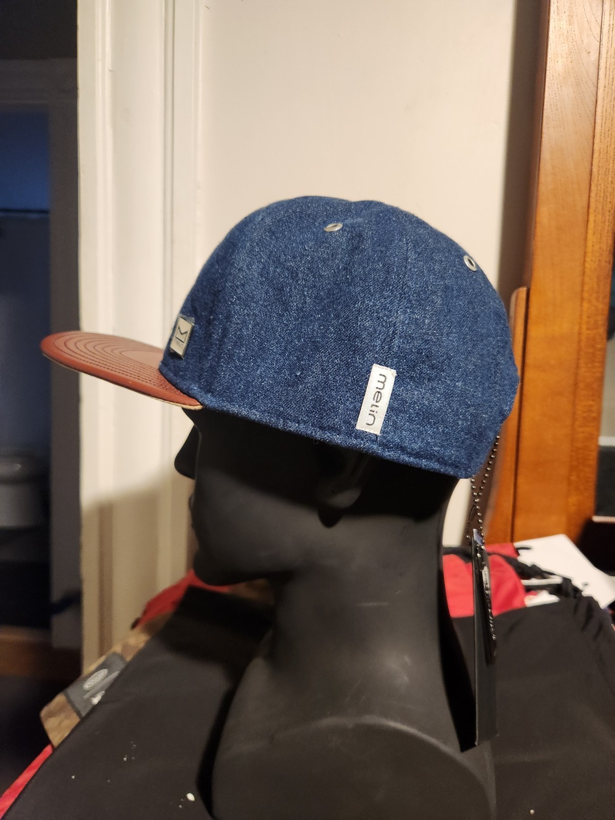 melins ivy league blue denim. GRIND, a original melin hat. this hat has original tags and has never been worn. its from the early days of melin, they used only high end materials,leather, suede. its from before size tags in there hats but its classic 58cm. the clear plastic is still on the front and under brim melin logos, its pristine. includes a leather wrapped display case with a soft melin labeled fabric inside and a c.o.a prominently displayed. this case is extremely high end. this would be the center if any melin lovers collection. must see pics!! firm on price.