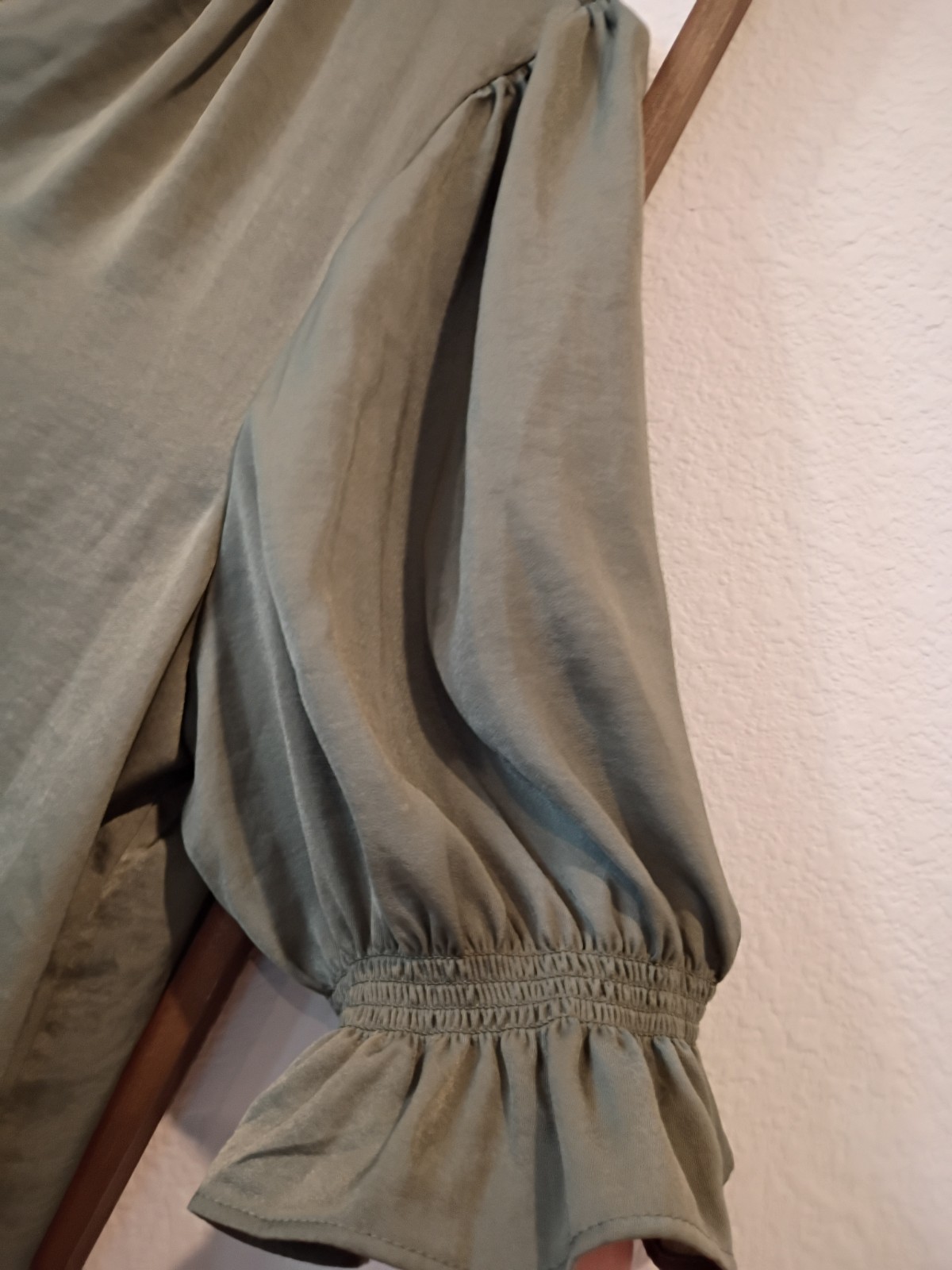 The Melloday Olive Green Satin Ruffle Sleeve Button Blouse in XL size is a stylish and elegant piece perfect for various occasions. Made from 100% polyester, this blouse offers a luxurious feel and a beautiful sheen. The ruffle sleeves and button detail add a feminine touch, while the olive green color adds a touch of sophistication. Perfect for pairing with jeans or trousers, this blouse is a versatile addition to any woman's wardrobe.