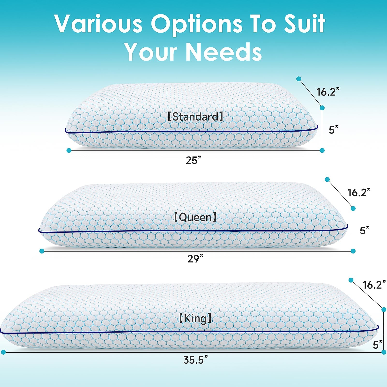 memory foam pillows will give you all night comfort, which can effectively relieve fatigue, improve the head or neck pain, insomnia. cooling pillow suitable for all side, back and stomach sleepers, and it’s a ideal gift for your family and friends! Premium Memory Foam: memory foam bed pillow is crafted with premium foam that adapts to your head, neck, and suitable for side, back and stomach sleepers. Soft yet supportive contouring and promotes all-night peaceful sleep with zero pressure points Ultra-Breathable & Machine-Washable Pillowcase: Detachable pillowcase features breathable fabric to accelerate airflow and heat dissipation. Removable pillowcase zips off for quick machine washing Ergonomic Design: The weight-sensitive foam naturally conforms to your body’s curves. Designed for side, back, or stomach sleepers, Memory Foam Bed Pillow balances comfort and intuitive design to help you wake up feeling rested Various Size Options for You: This bed pillow comes in three sizes: Standard 25"x16.2", Queen 29"x16.2", King 35.5"x16.2". Find your great fit – ideal for solo sleepers or as a thoughtful gift. Twin-pack options available for couples Durability & Easy Care: CertiPUR-US certified and built with high-density memory foam, bed pillow retains its shape night after night—resists sagging over time while delivering lasting comfort and support. Note: Allow 24-48 hours for full expansion after unboxing