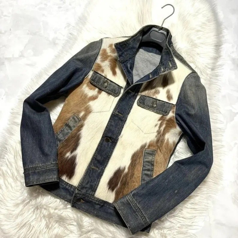 Stand out from the crowd with this unique cow print denim jacket for men , handcrafted from real cowhide hair-on leather and soft pony skin , combined with rugged premium denim . Each jacket is made using natural hair-on cowhide , so the pattern may slightly vary — giving every piece a one-of-a-kind look . 🟤 Key Features: Made from genuine cowhide leather with natural hair-on texture Stylish black & white cow print design Blended with pony skin for softness and comfort Rugged denim base for all-season wear Available in multiple sizes – fits true to size Perfect for casual wear, layering, or western events Great gift for men who love bold and premium outerwear This jacket is designed for men who value authentic fashion and superior quality . Whether you're going to a concert, a country-themed event, or just heading out, this jacket adds instant character to your outfit. 🧼 Care Instructions: Spot clean with a damp cloth Use leather conditioner to keep the material soft Avoid machine washing and excess moisture 🎁 Note: Due to the natural cowhide, each jacket is slightly different in pattern and texture , making your jacket truly one-of-a-kind.