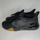 These are Men's Reebok Nano Court Tennis Pickleball Shoes in Black, size 10.5. They are Low Top Sneakers with a Tie closure, suitable for various activities like tennis, pickleball, cross training, CrossFit, basketball, and running. The shoes feature a colorful design with a synthetic upper, lining, and insole materials, and a rubber outsole. Ideal for athletic use, they offer a comfortable fit with a Medium width.