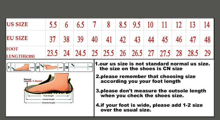 Size Chart: US SIZE 6.5=EU SIZE 39=Foot length =9.64 inches= 24.5cm US SIZE 7=EU SIZE 40=Foot length =9.84 inches= 25.0cm US SIZE 8=EU SIZE 41=Foot length =10.04 inches= 25.5cm US SIZE 8.5=EU SIZE 42=Foot length =10.24 inches= 26.0cm US SIZE 9.5=EU SIZE 43=Foot length =10.43 inches= 26.5cm US SIZE 10=EU SIZE 44=Foot length =10.63 inches= 27.0cm US SIZE 11=EU SIZE 45=Foot length =10.84 inches= 27.5cm US SIZE 12=EU SIZE 46=Foot length =11.05 inches= 28.0cm US SIZE 13=EU SIZE 47=Foot length =11.22 inches= 28.5cm Note 1:Size tag of the shoes show Chinese size,which are not the European size.But they are exactly the same length as the European size which you ordered. 2: There might be slightly color difference due to different light and monitor effect.
