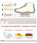 How to choose the correct size: Step 1. Please measure your foot length carefully,when you choose the size. Step 2. Please choose the correct size according to your foot length For example, if your foot length is 26 cm, you should choose the size 42. Step 3. If you are not sure of the correct size, you can click Contact Us!!! NOTE: Don't choose the size based on the Insole length and Outsole length! Feet length=Insole length-(0-1.5) cm 1. Please allow 1-1.5 error due to the Manual Measurement;2.Please choose the size only according to your foot length;3. lf your feet is wide or thick, we suggest you choose one size large