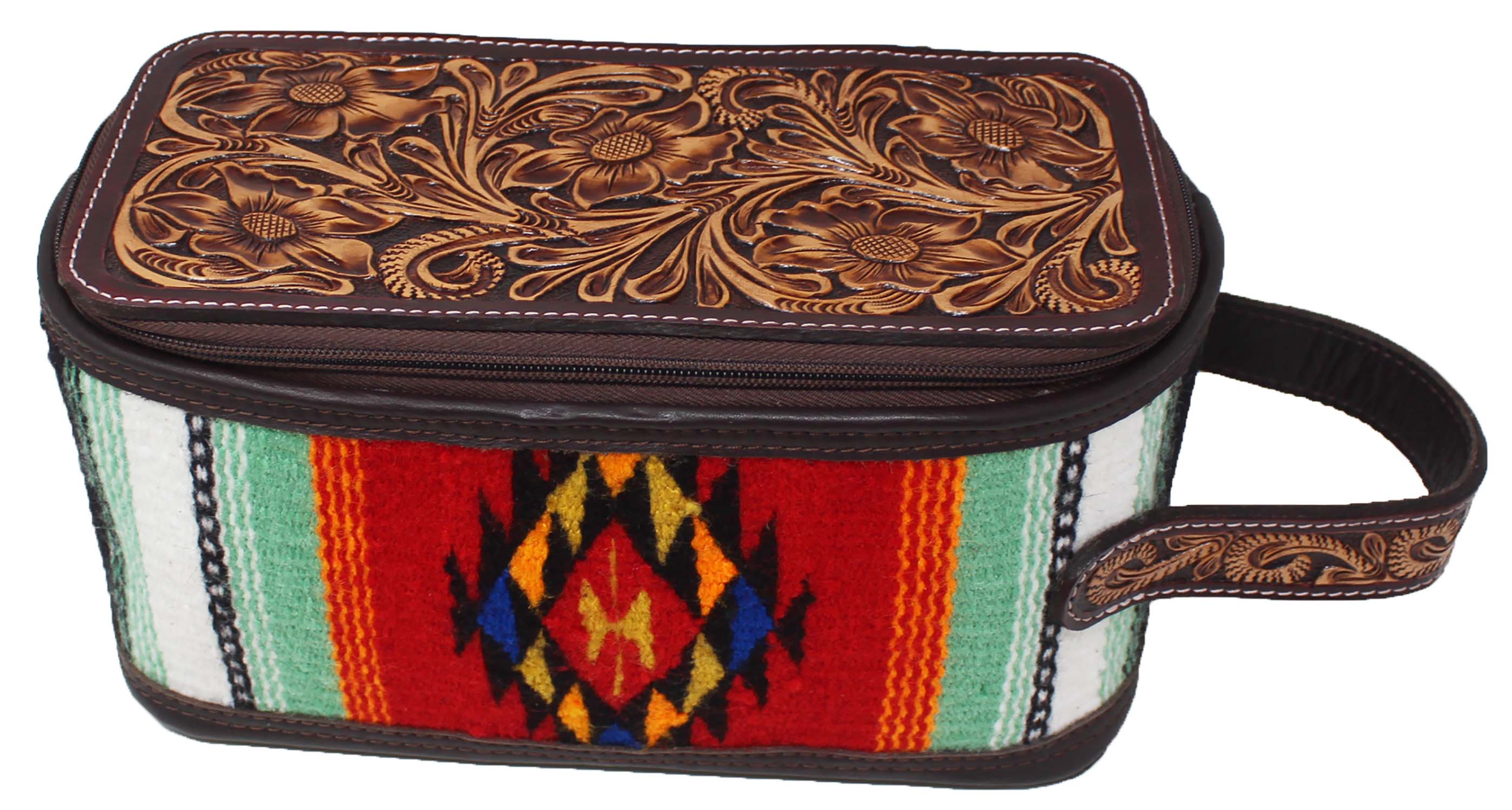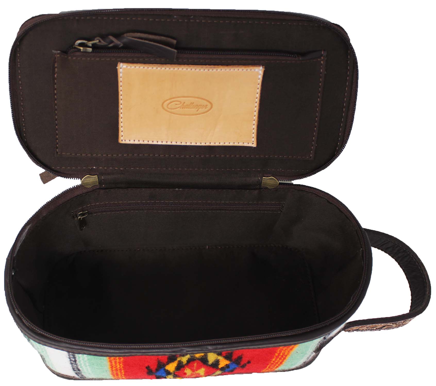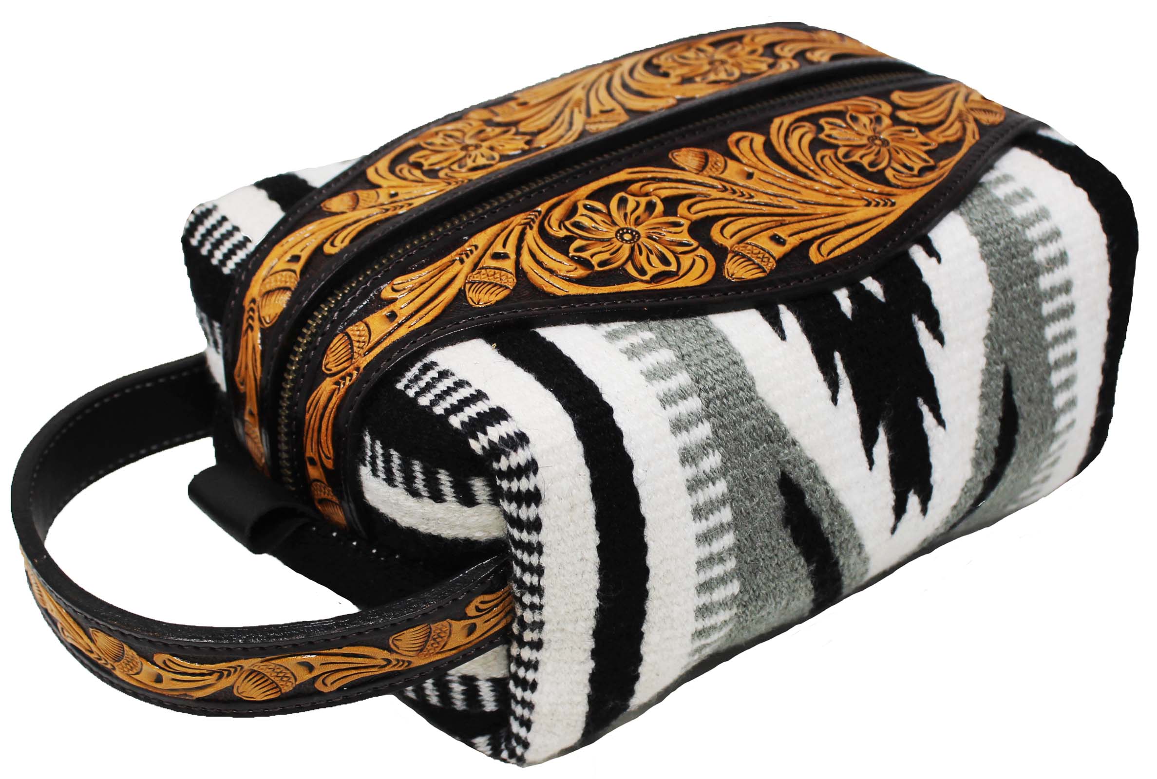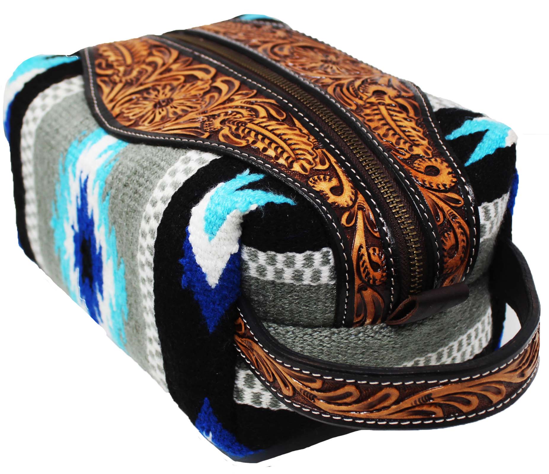 Description Tack Market. Top Brand and Quality products at rock bottom prices. Challenger toiletry dopp bag made from beautiful multicolored handwoven wool. This bag features hand-tooled antique floral leather accents. Perfect choice for travel, and weekend trips. Conveniently sized roomy bag fits all toiletry essentials. The fully lined interior also features a side zippered pocket, and open pockets for additional storage. Bag measures 9" L x 6" W x 4-1/2" H. Shipping Items will be shipped within 24 hours of payment received during business days. We observe major US holidays. We use United State Postal Service and UPS Ground as our shipping carrier. Free shipping is only within US with exception of Alaska, Hawaii, PR. We do offer expedited shipping. We ship worldwide. We prefer shipping with UPS for Canada. Physical address is required for large items such as saddle, blankets, saddle bags. We do offer shipping discount for multiple items. Please do not pay each item separately if you want to get combine shipping rate. Combined shipping rate for multiple items in auction format $5.00 off on each additional Item. Payment We accept PayPal payment or major credit cards. Payment must be received within 5 days after auction ends. Texas residents pay 8.25% sales tax. Returns We're happy to exchange your item or refund your money If you are not completely satisfied, you may return your unused item within 30 days from your date of purchase for refund. Return shipping is at the customer's expense. 20% restocking fee will be deducted from original cost. Refund will be madeupon receipt of the item. Shipping cost for an exchange of size or an item less than 20lbs is $15. Send return item with a copy of packing slip.