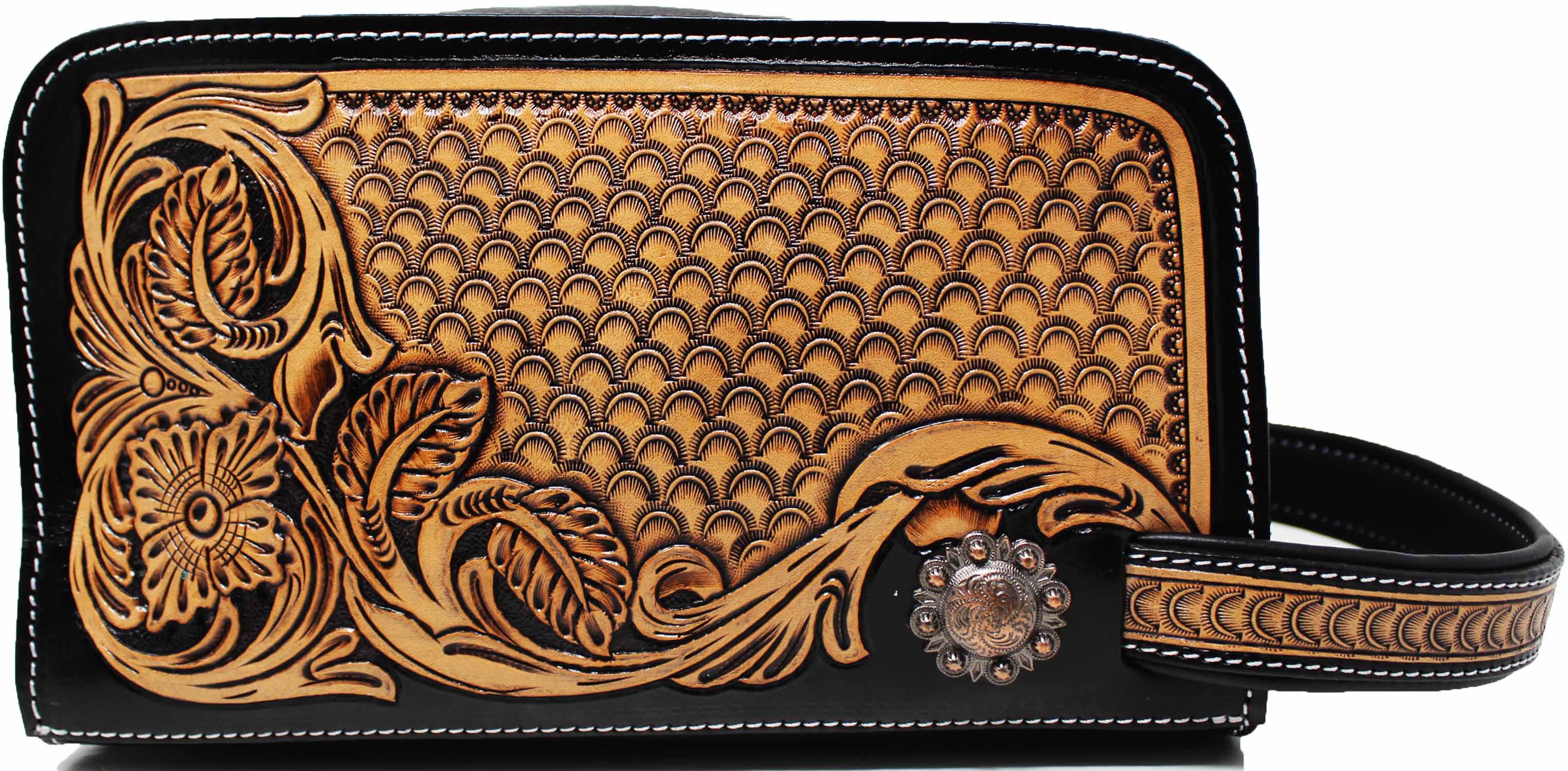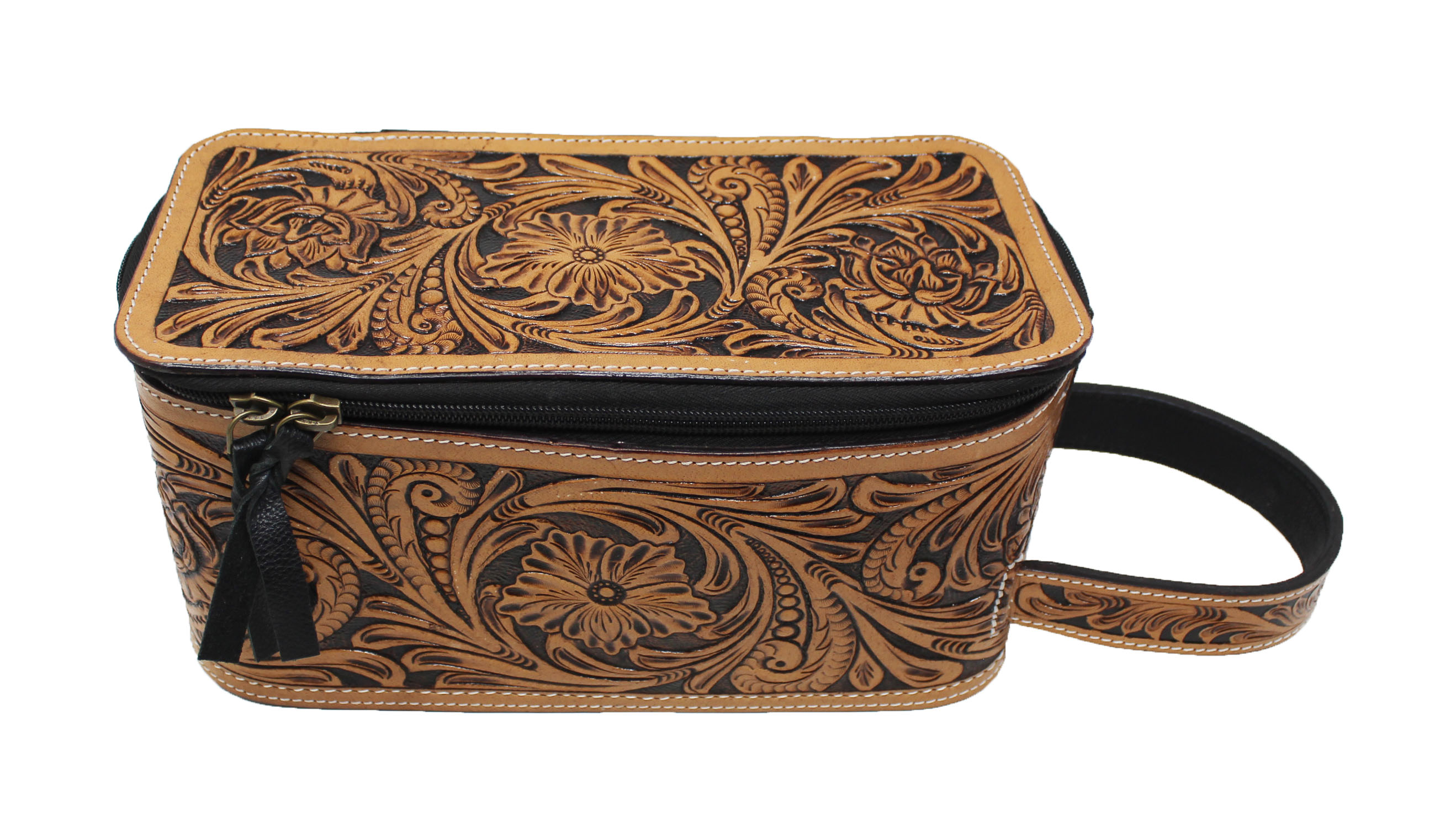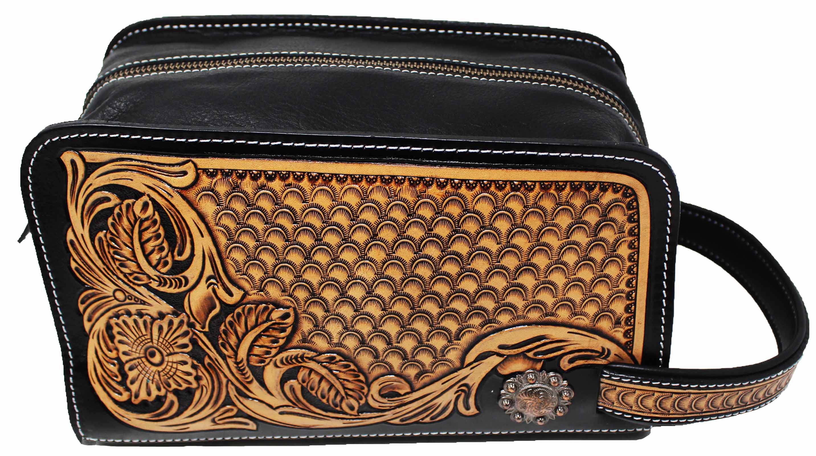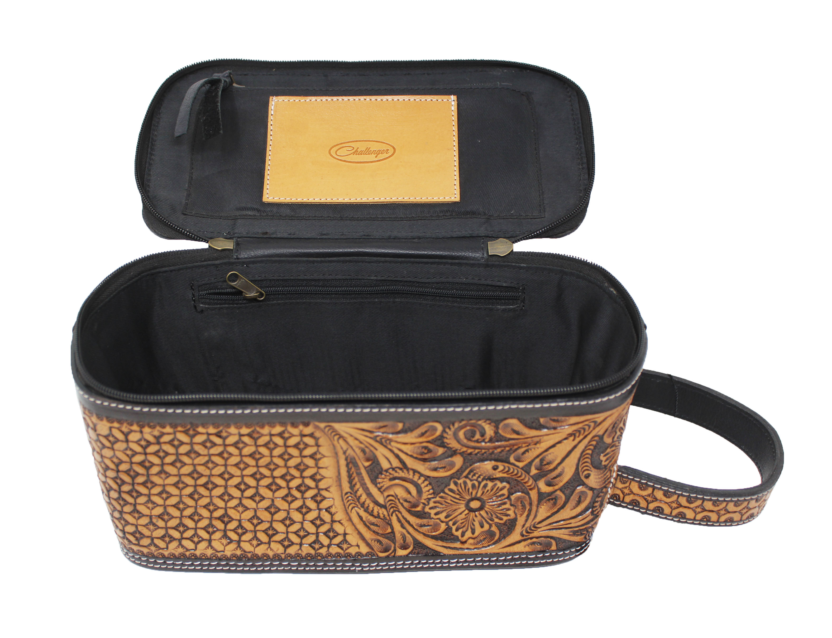 Description Tack Market. Top Brand and Quality products at rock bottom prices. Challenger toiletry dopp bag made from beautiful multicolored handwoven wool. This bag features hand-tooled antique floral leather accents. Perfect choice for travel, and weekend trips. Conveniently sized roomy bag fits all toiletry essentials. The fully lined interior also features a side zippered pocket, and open pockets for additional storage. Bag measures 9" L x 6" W x 4-1/2" H. Shipping Items will be shipped within 24 hours of payment received during business days. We observe major US holidays. We use United State Postal Service and UPS Ground as our shipping carrier. Free shipping is only within US with exception of Alaska, Hawaii, PR. We do offer expedited shipping. We ship worldwide. We prefer shipping with UPS for Canada. Physical address is required for large items such as saddle, blankets, saddle bags. We do offer shipping discount for multiple items. Please do not pay each item separately if you want to get combine shipping rate. Combined shipping rate for multiple items in auction format $5.00 off on each additional Item. Payment We accept PayPal payment or major credit cards. Payment must be received within 5 days after auction ends. Texas residents pay 8.25% sales tax. Returns We're happy to exchange your item or refund your money If you are not completely satisfied, you may return your unused item within 30 days from your date of purchase for refund. Return shipping is at the customer's expense. 20% restocking fee will be deducted from original cost. Refund will be madeupon receipt of the item. Shipping cost for an exchange of size or an item less than 20lbs is $15. Send return item with a copy of packing slip.