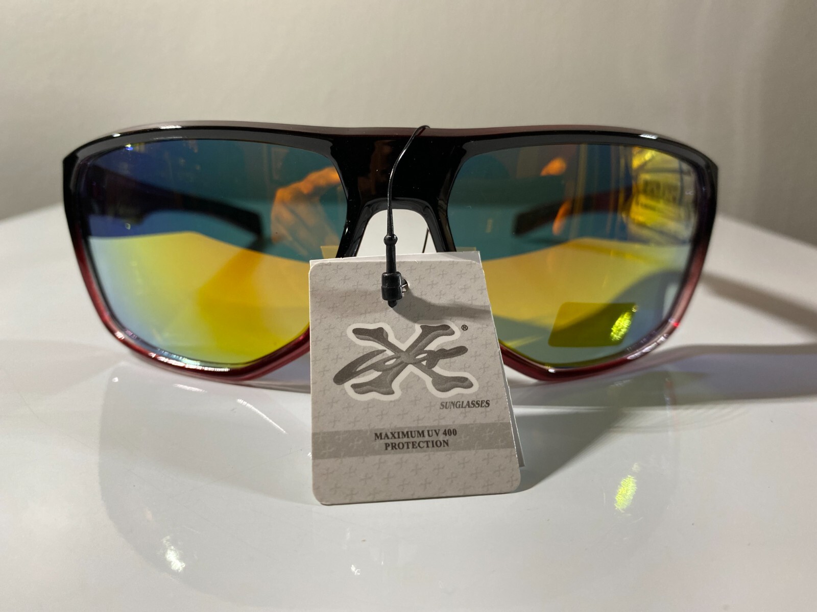 Men's wrap around sunglasses with black frame and yellow reflective lenses. Great price.