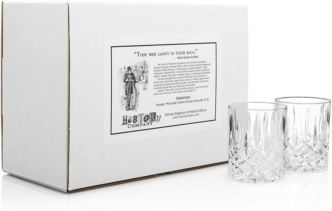Store New Arrivals Add to Favorite View Feedback Contact Men'S Bar at the Astor Crystal Whiskey Glass – Best Gift for Bourbon Lovers – 2-Piece Set of Luxury Old Fashioned Tumblers (Gift Box Collection) Description Item model number TT24 Style Weighty, clubby, meticulously-crafted in nearly 1-pound of lead-free crystal Number of Items 2 Pattern Solid Country of Origin Germany Theme Inspired by the legendary New York Men’s Bar of an earlier century Unit Count 2 Count Product Dimensions 3.5"W x 4"H Material Crystal Capacity 9 Fluid Ounces Age Range (Description) Adult Is Discontinued By Manufacturer No Specific Uses For Product Versatile for drinks built in the glass, pours of whiskey, Scotch, bourbon, or vodka, cocktails and mixed drinks with ice Included Components History of New York's Astor Hotel and the legendary Men-Only Bar Reusability Reusable Customer Package Type Standard Packaging Item Weight 2.51 pounds Material Feature Insulated Occasion Housewarming, Father's Day, Cocktail Party Special Feature function(f) {var _np=(window.P._namespace("DetailPageProductOverviewTemplatesJava"));if(_np.guardFatal){_np.guardFatal(f)(_np);}else{f(_np);}}(function(P) { P.when('A').execute(function(A){ A.on('a:truncate:po-attribute-truncate-2:updated', function(data) { var isTruncated = !data.truncateInstance.getIfTextFits(); var seeMoreElement = document.getElementById('po-attribute-see-more-id-2'); if(seeMoreElement) { seeMoreElement.style.display = isTruncated ? '' : 'none'; } }) }); })); Artful cut-glass design enhances the presentation of each drink and raises its joyful, celebratory spirit See more Material Type Free Lead Free Color Clear and brilliant Finish Type Textured Shape Round Recommended Uses For Product Versatile for drinks built in the glass, pours of whiskey, Scotch, bourbon, or vodka, cocktails and mixed drinks with ice Product Care Instructions Dishwasher Safe Size 2 Count (Pack of 1) Crystal Whiskey Glass Set of 2: These glasses embody bold elegance, timeless craftsmanship, and an air of exclusivity. Inspired by the legendary Astor Hotel and its iconic Men’s Bar, where New York’s power brokers, authors, and celebrities once gathered. Featured in Food & Wine Magazine: This Gift Box Set of 2 weighty, clubby, limited-edition Whiskey Glasses made the magazine’s list of “Best Gifts for Bourbon Lovers.” For gifting with effortless sophistication; ideal for celebrations - dinner parties, birthdays, engagement, wedding, housewarming, anniversaries A Sense of History & Prestige: Inspired by New York's Astor Hotel and the legendary Men’s Bar; each assertive, meticulously-crafted glass enhances the presentation of the drink and raises its joyful, celebratory spirit. Crafted for those who appreciate heft and quality, these glasses sit solidly in the hand – offering a luxurious, clubby experience that enhances the enjoyment of fine whiskey. Meticulously Crafted for Connoisseurs: Artful cut-glass design makes a statement, optimizing visual aesthetic, illuminating the various hues of whiskey or cocktail, catching and reflecting light; the sculpted design actually adds a layer of insulation, keeping drinks cold from start to finish;.wide mouth allows spirit and bitters aromatics to waft up to the nostrils, elevating the sensory sipping experience. Perfect for the Modern Gentleman's Bar: Multipurpose and utilitarian; each glass is artisan-crafted in nearly 1-pound of lead-free crystal; feels good in the hand and looks good on the bar; perfect for spirits and cocktails, on the rocks, or neat; serve whiskey, bourbon, and rum in these crystal glasses Whether for personal indulgence or impressing guests, these glasses exude old-school luxury with modern refinement – ideal for a well-appointed home bar. Dimensions for Superior Functionality: 4-inches (Height); 3-1/2-inch (Top Diameter); 9 ounces (Volume Capacity); dishwasher safe; ideal because it’s very durable and less prone to breaking from thermal shock (sudden or extreme changes in temperature); notable for impact resistance; built to withstand the daily rigors of high-volume consumer traffic environments. MEET THE BRAND: Since 1997, HISTORY COMPANY has specialized in extraordinary products inspired by history and authenticity, where ‘Every Gift Holds a Story,’ and where you are sure to find the perfect item for keeping or giving. Re-Introducing the "Men’s Bar" Whiskey Glass – One Pound of Crystal Its origins trace back to 1904, when millionaire William Waldorf Astor opened the grand Hotel Astor in New York’s Times Square. Within its opulent walls was the legendary Men-Only Bar, where the drinks flowed from 6 AM to 1 AM daily, and ten bartenders stood ready to serve an elite clientele. This wasn’t just any watering hole—it was a gathering place for captains of industry, literary giants, and high-stakes gamblers alike. Here, Pierpont Morgan sipped alongside Mark Twain, Buffalo Bill Cody, Vice President Charles Warren Fairbanks, Alfred E. Smith, John “Bet a Million” Gates, and the larger-than-life Diamond Jim Brady. Actors mingled with financiers, athletes toasted with industrial titans, and all were bound by a shared appreciation for finely made drinks, served in finely made glasses. What set the Hotel Astor’s Men’s Bar apart was not just its clientele, but the way it presented its whiskey—in nearly one pound of crystal, a glass designed to be held with authority. These substantial whiskey tumblers weren’t just drinkware; they were an expression of conviviality, power, and tradition, meant to be cupped in the palm, felt in the hand, and raised in good company. Now, this storied glassware returns, true to its historic proportions and weight, preserving the grandeur of an era when men were men, and women were glad of it. Presented in a Gift Box Set of Two Hotel Astor “Men’s Bar” Crystal Whiskey Glasses, complete with a bit of Hotel Astor history—for keeping or giving, and always for raising
